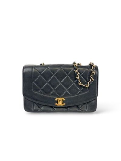 Chanel vintage Diana shoulder bag in black quilted leather and 24k gold-plated jewelry. It features an adjustable gold-plated shoulder strap interlaced with black leather allowing for shoulder or sling wear.