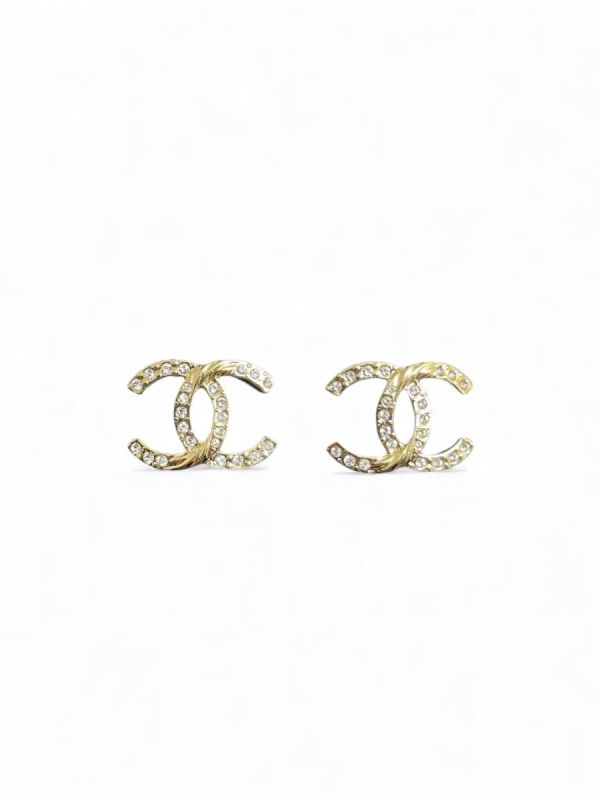 Chanel twisted earrings in gold-plated metal, embellished with sparkling rhinestones forming the famous double C. A dazzling piece of jewelry that elegantly captures the light and embodies the timeless refinement of the House.