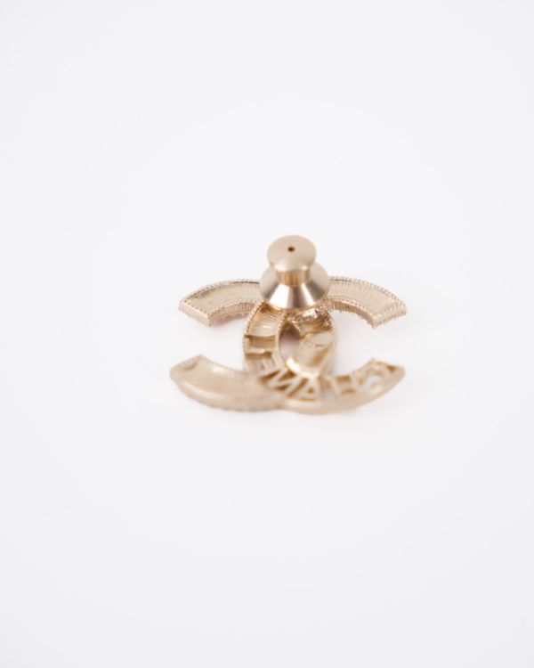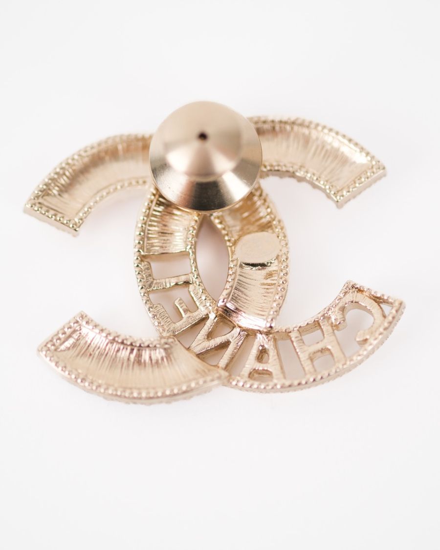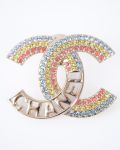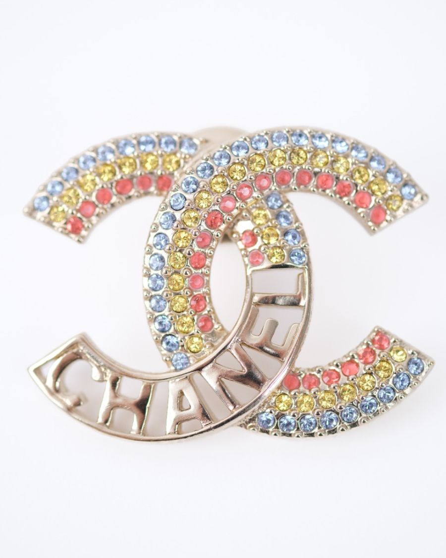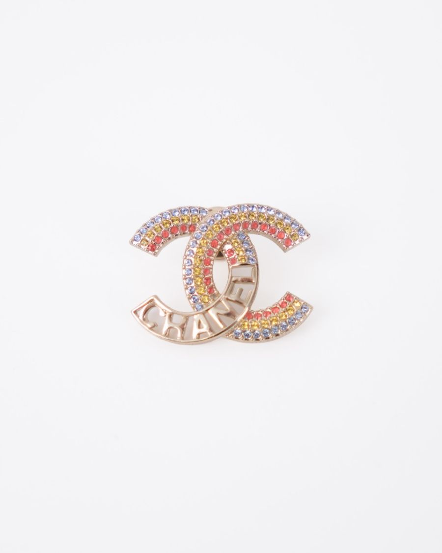 Chanel XS Champagne Brooch with Multicolored Rhinestones and “CHANEL” Lettering
