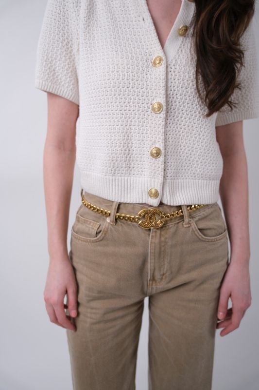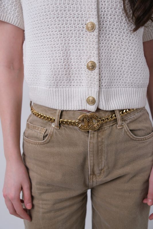 This golden Chanel belt captivates with its iconic curb chain embellished with the famous finely engraved CC logo. Elegant and timeless, it adds a couture touch to any outfit, worn at the waist or on the hips. An iconic accessory with vintage charm, ideal for enhancing a look with character and refinement.