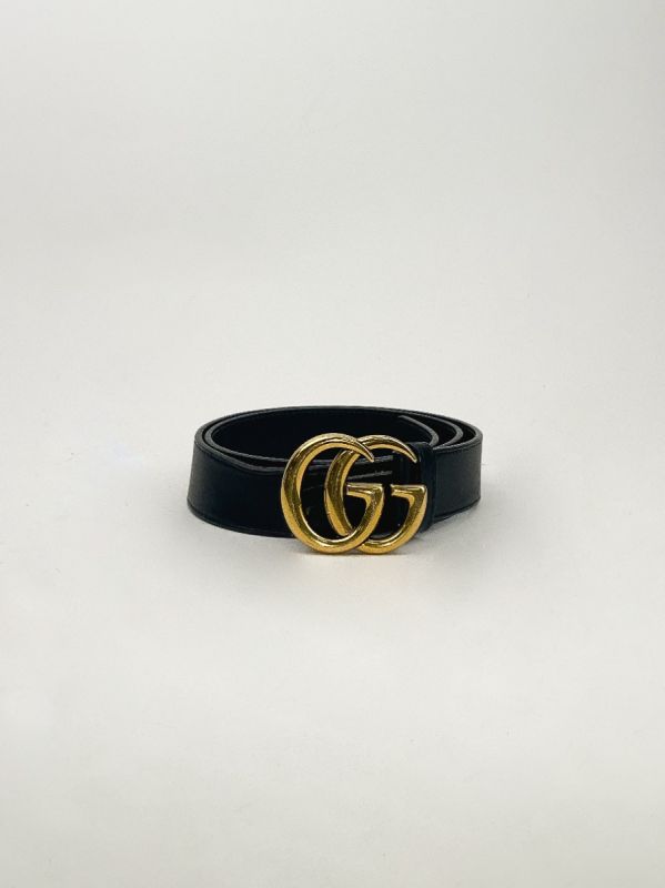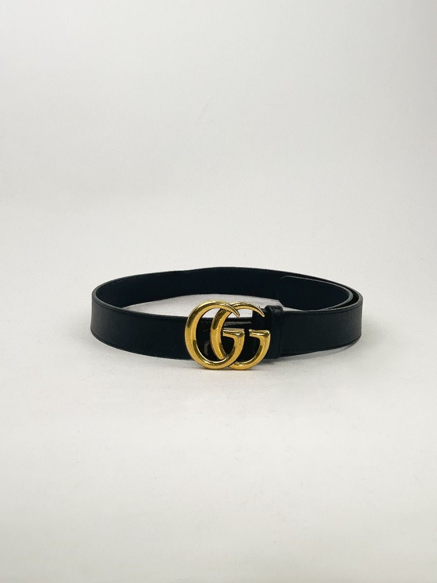 An icon of the House of Gucci, this black leather belt stands out with its iconic GG buckle in shiny gold metal. Elegant and timeless, it enhances both casual and more sophisticated outfits. The buckle has a few slight scratches, but these do not detract from its shine or elegance.