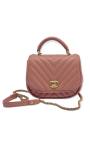 This chic tote is crafted of chevron quilted smooth lamskin leather in pink. The shoulder bag features a sturdy rolled leather top handle, a matte gold chain link leather threaded shoulder strap with a leather shoulder pad, a rear patch pocket, and a matte gold CC turn clock closure. This opens the flap to a matching interior with patch and zipper pockets.