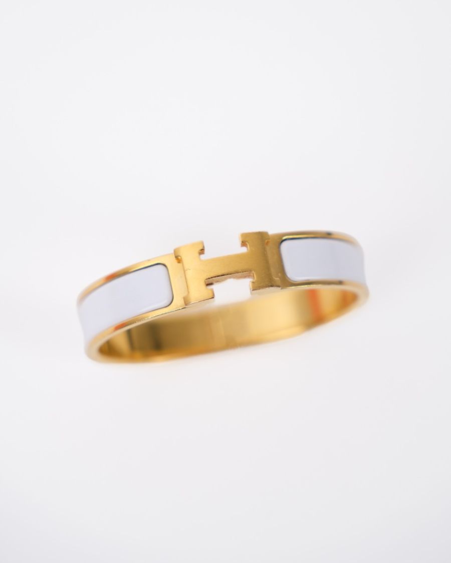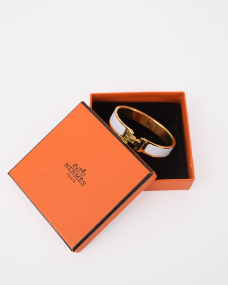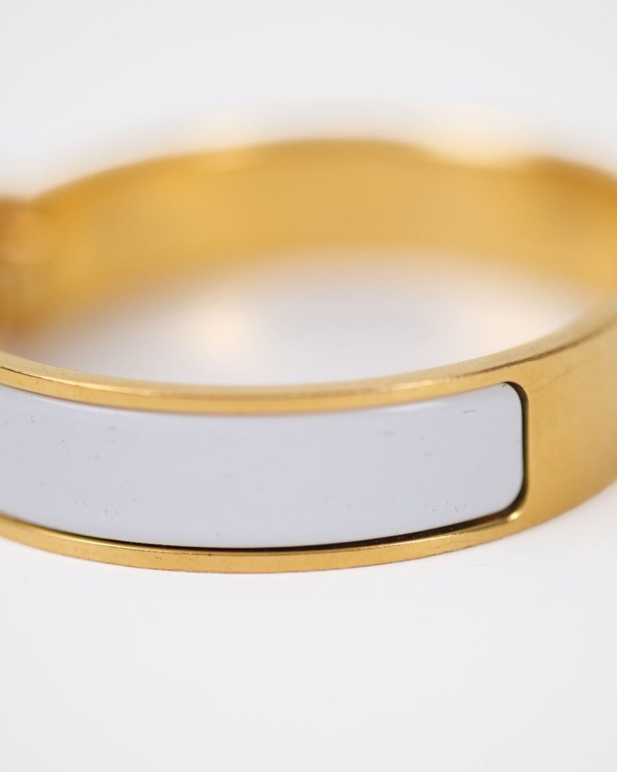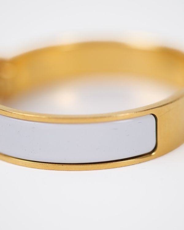 Hermès Clic H bracelet in white enamel with a gold-plated finish, a symbol of chic and understated style. Combining modernity and sophistication, it enhances the wrist with a touch of timeless elegance characteristic of Hermès.
