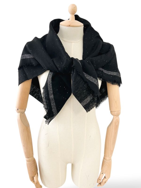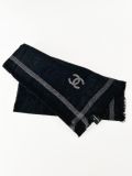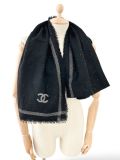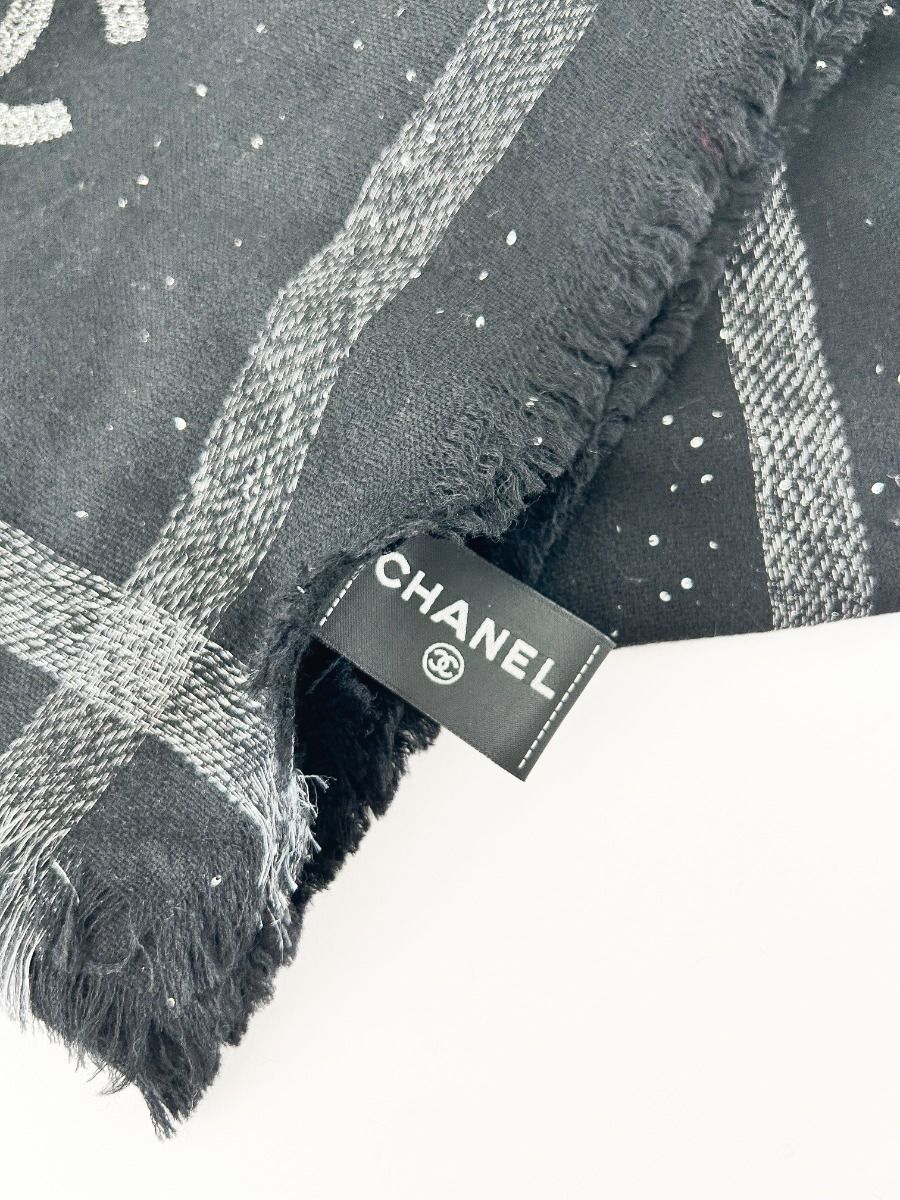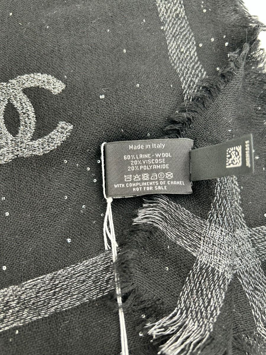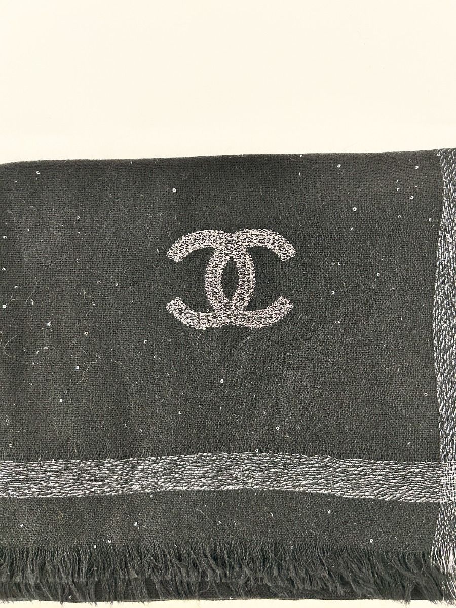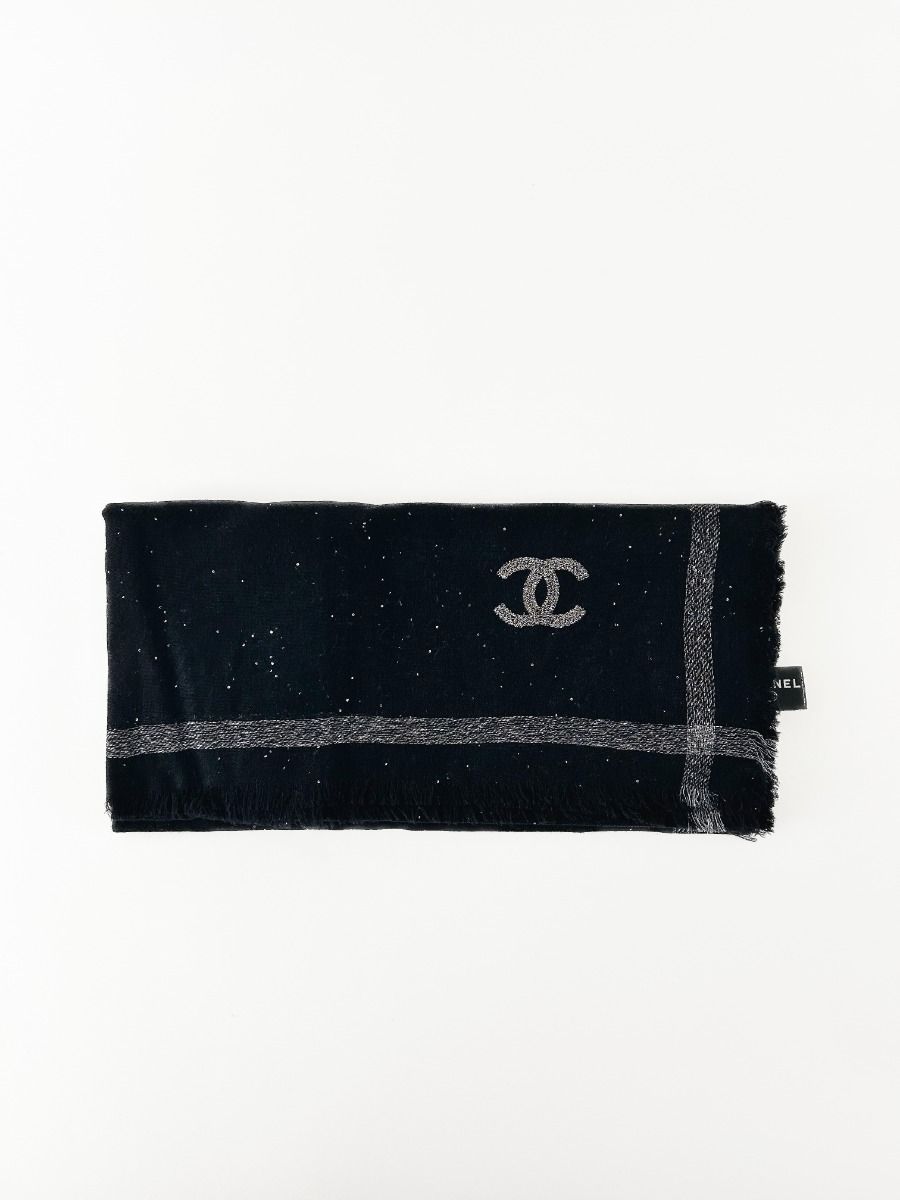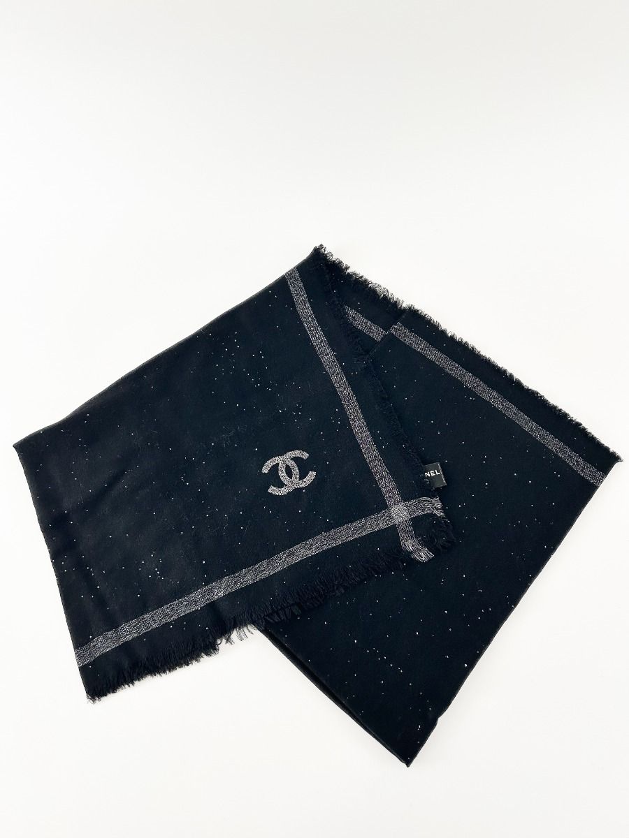 Black Chanel wool shawl, embellished with delicate sequins and the iconic CC logo. Elegant and luminous, it adds a touch of glamour while remaining timeless. An ideal luxury accessory to enhance any outfit, day or night.