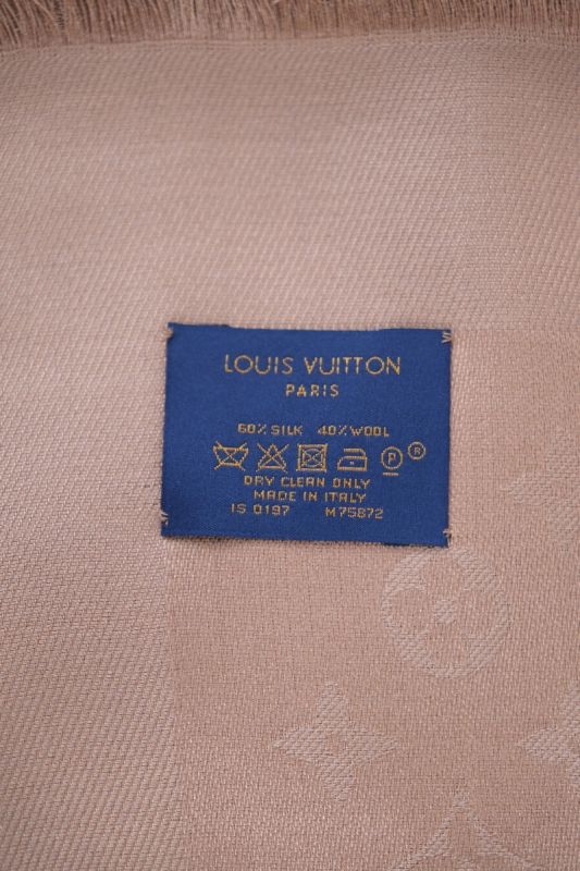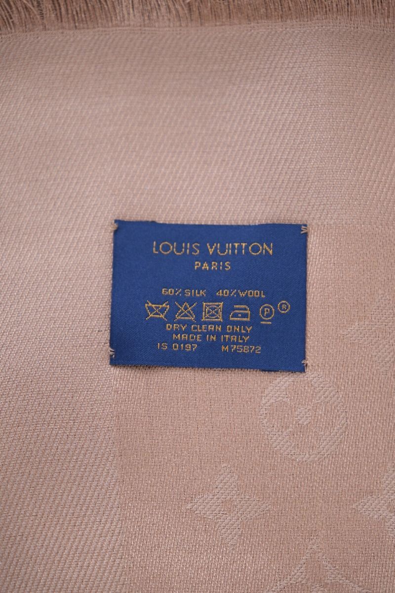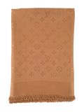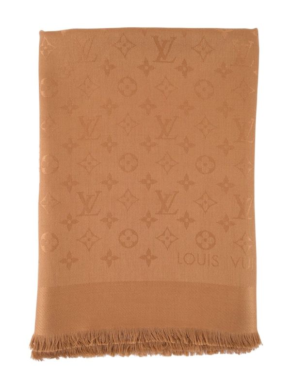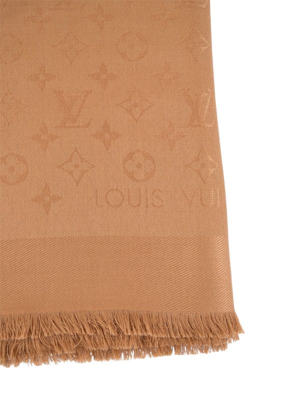 The Louis Vuitton Caramel Monogram Shawl in wool and silk blend is an elegant and timeless piece, ideal for sublimating your outfits. It can be worn in a multitude of ways. This model features Louis Vuitton's famous Monogram motif, revisited in a caramel hue, for a chic, refined style. Prized by collectors and fashion lovers alike, this shawl is a luxurious accessory that combines comfort and sophistication.