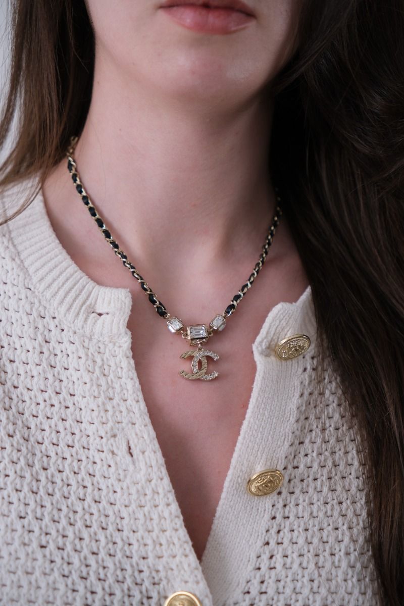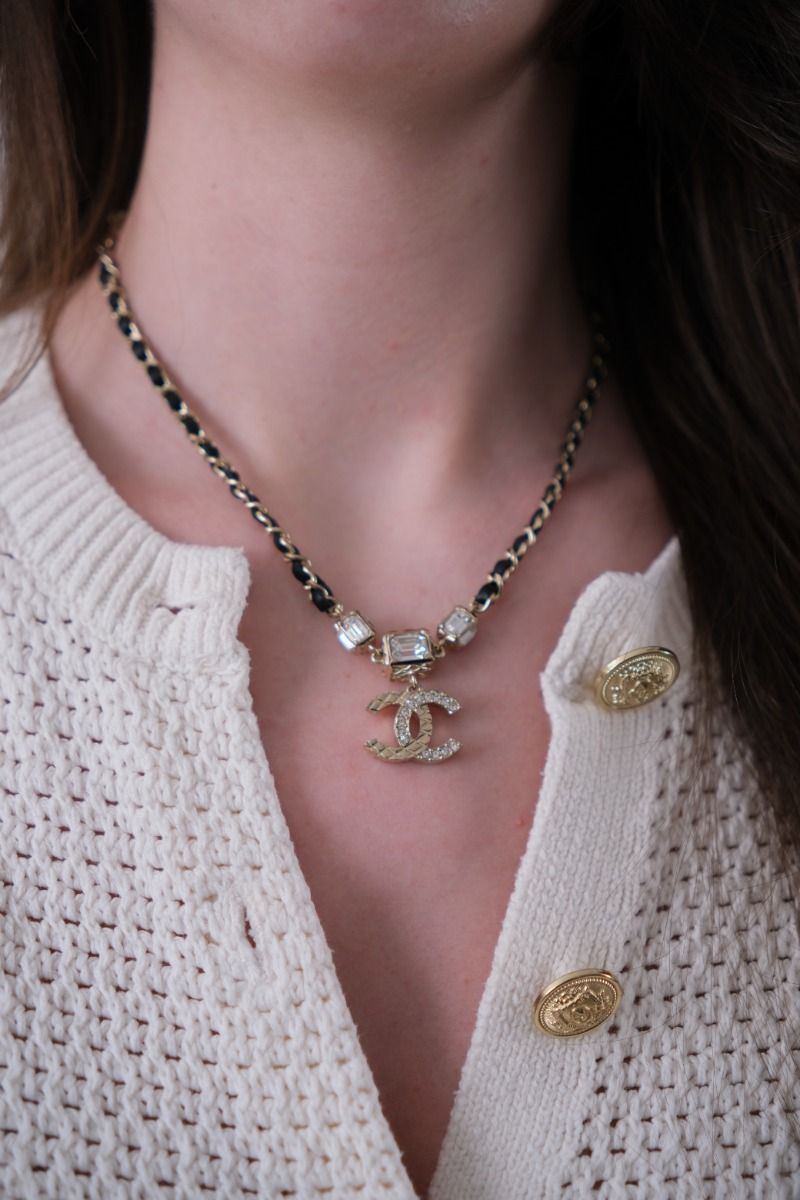 This Chanel choker with double CC rhinestone pendant stands out with its iconic intertwined chain and sparkling crystals. Feminine and elegant, it adds a touch of sparkle to all your outfits, from everyday wear to formal occasions. A refined creation from the House of Chanel, perfect for enhancing your décolletage.