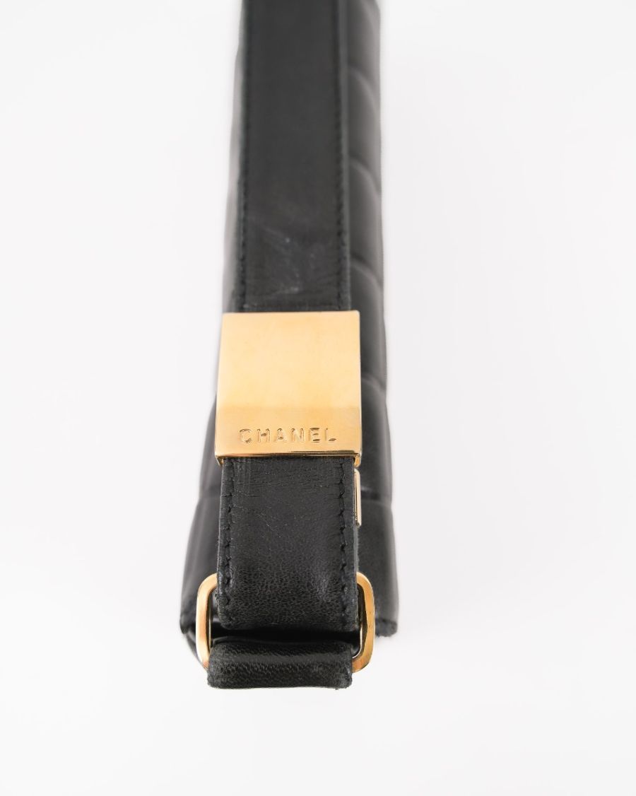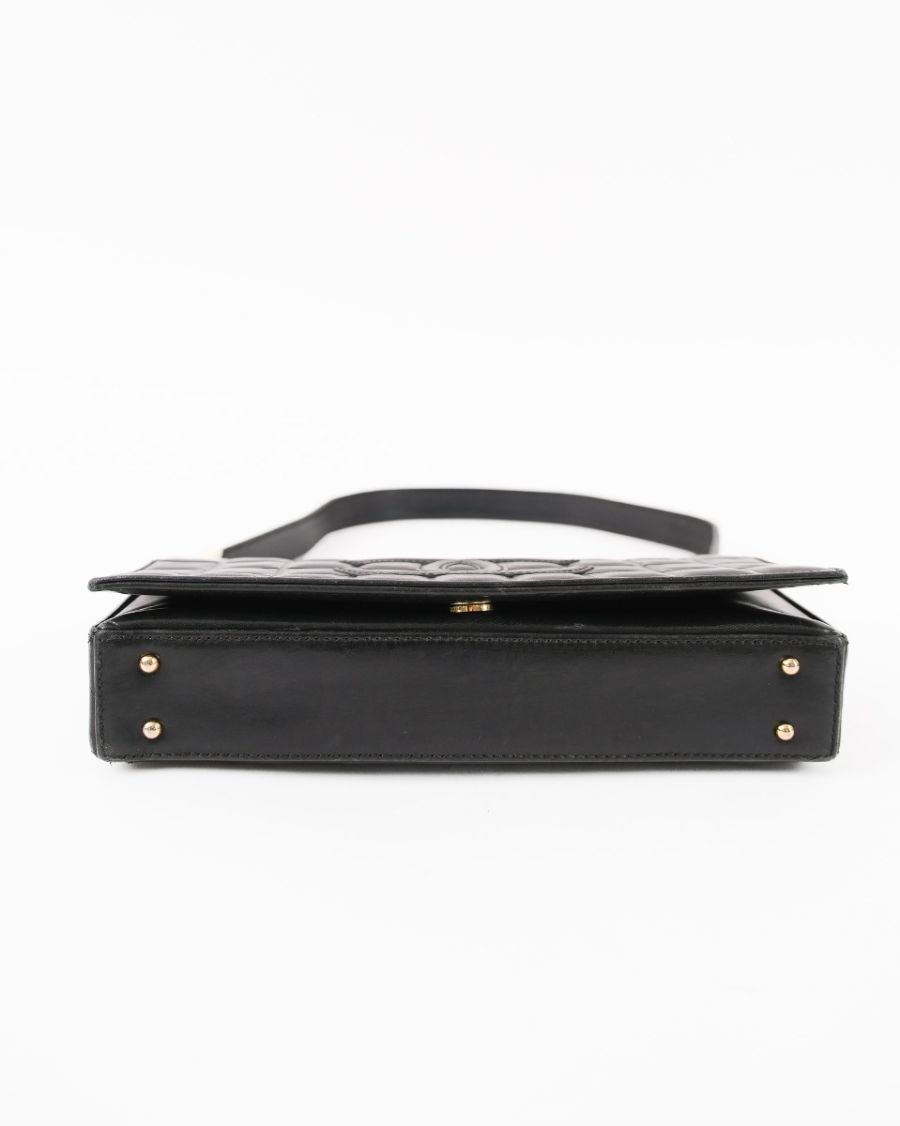 This black quilted leather bag features an iconic CC logo stitched on the front, symbolizing timeless elegance. Its structured silhouette and gold hardware add a chic and refined touch, ideal for sophisticated shoulder wear. A must-have piece, perfect for enhancing both your everyday outfits and more formal looks.
