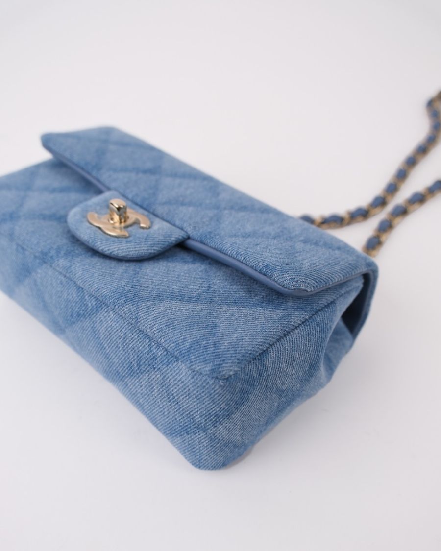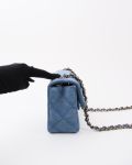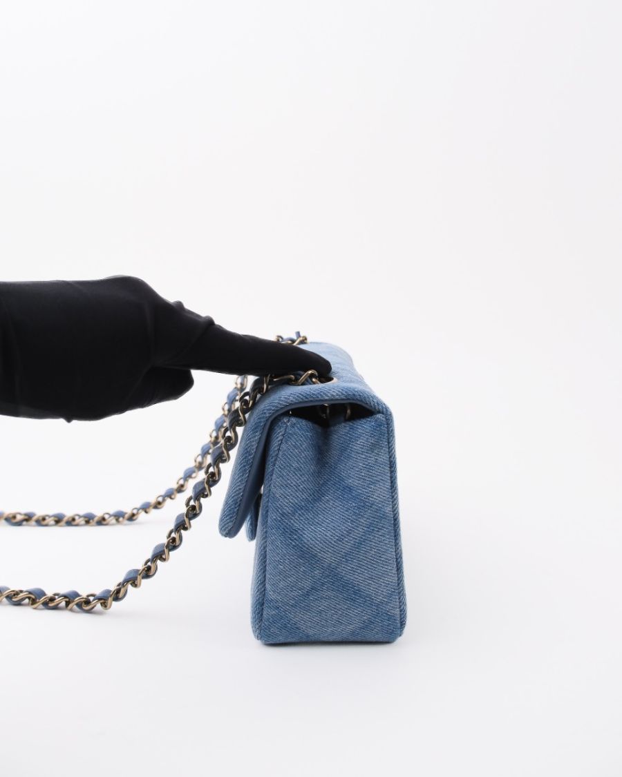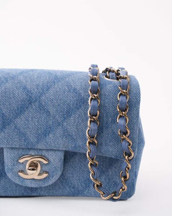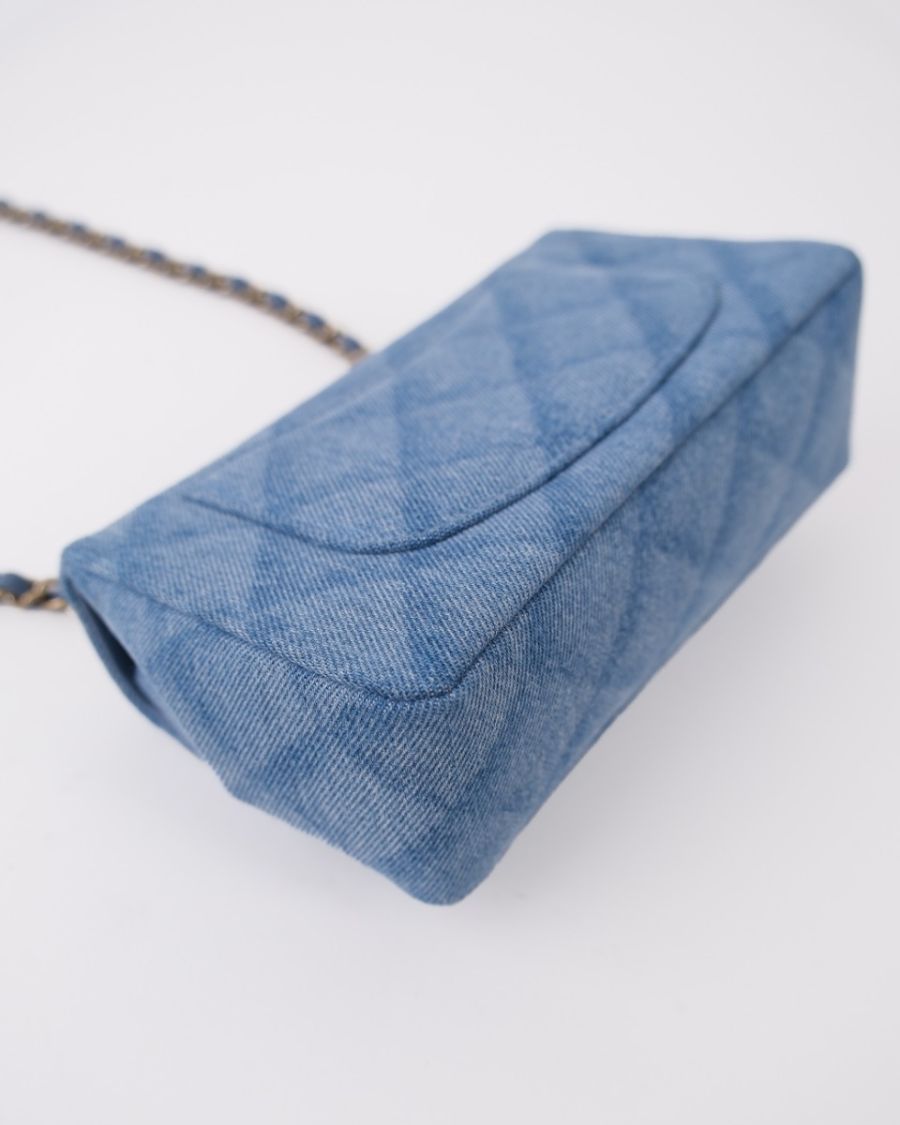 This blue denim Chanel bag embodies the timeless elegance of the House of Chanel, enhanced by a modern and casual touch. Crafted from refined denim, it offers a chic and contemporary look, ideal for enhancing both everyday outfits and more sophisticated looks. Its iconic interlocking CC clasp and intertwined leather and gold metal chain are testament to the brand's emblematic craftsmanship and attention to detail. Compact yet functional, this bag is designed to accompany you in style at every moment, while asserting a discreet and confident luxury.