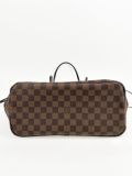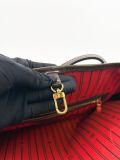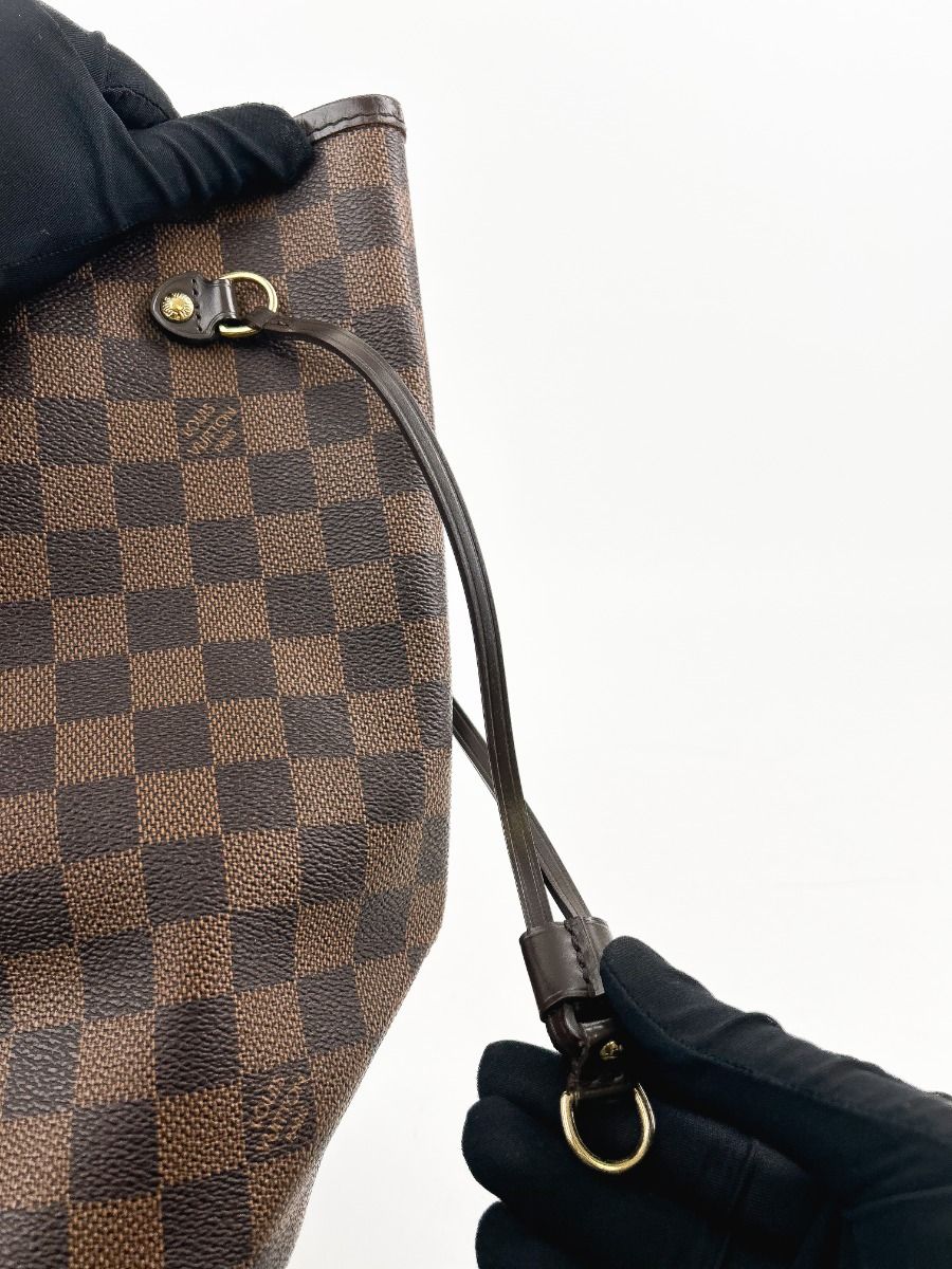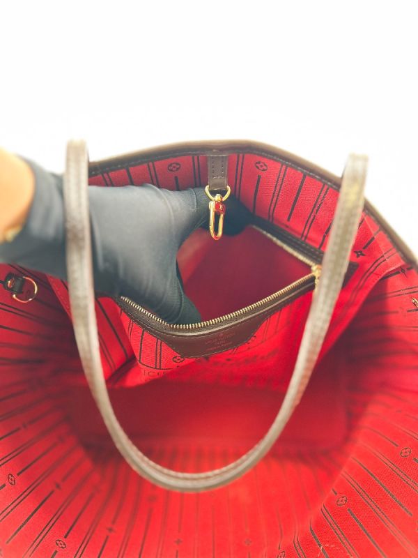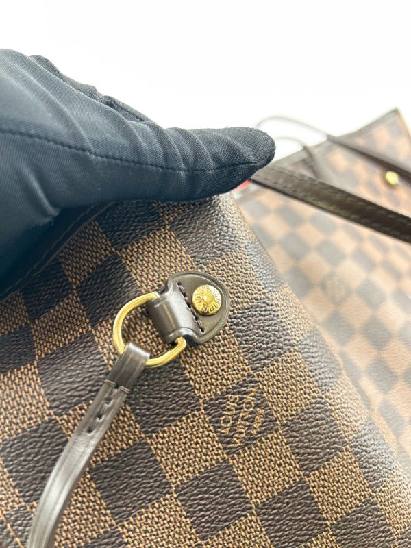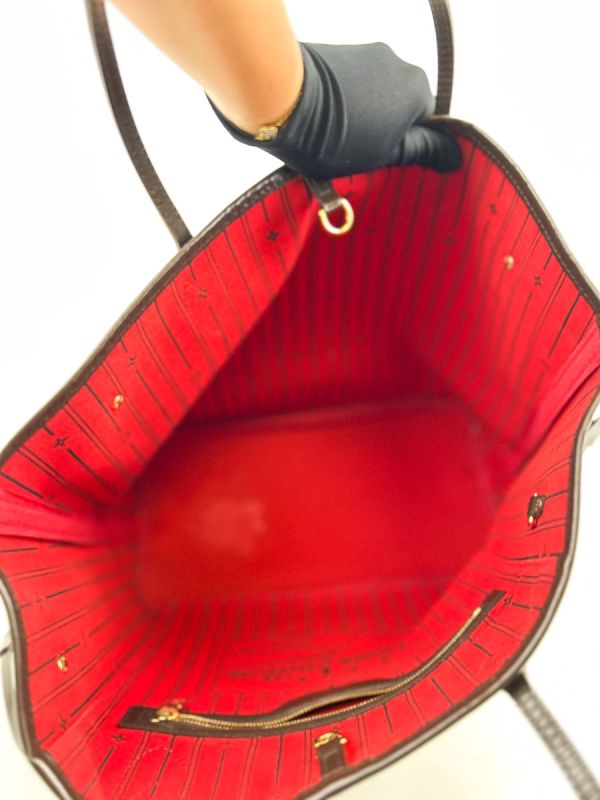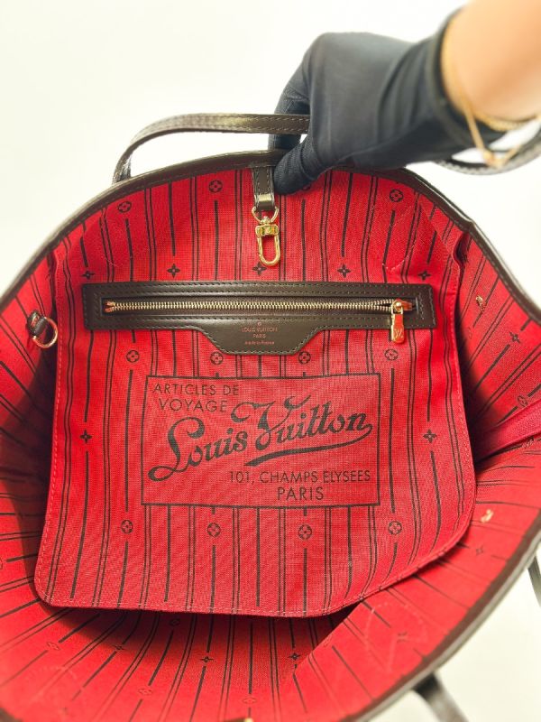 Elegant and spacious, this Louis Vuitton Neverfull bag in Damier Ebene canvas captivates with its bright red interior and timeless silhouette. Functional and refined, it features an interior zippered pocket for added convenience. Please note that there is a slight mark visible on the bottom of the bag, which does not affect its elegance or usability.