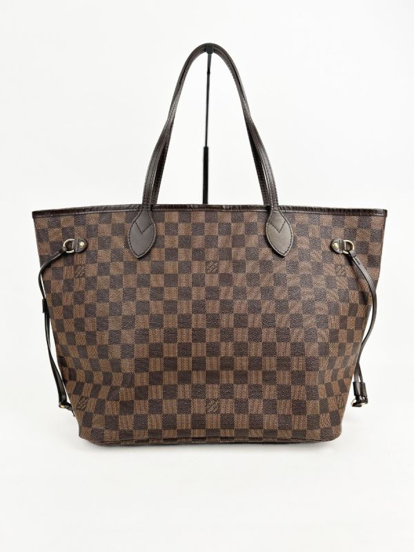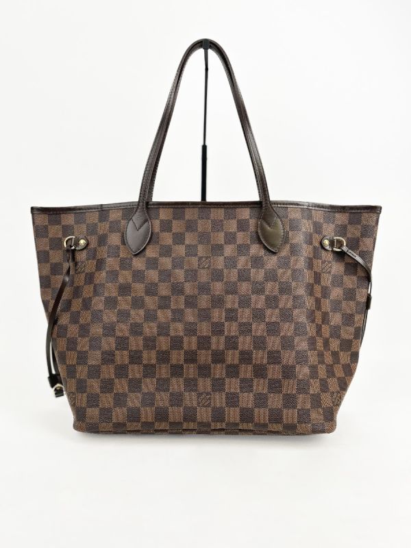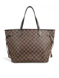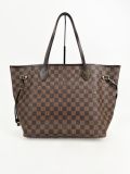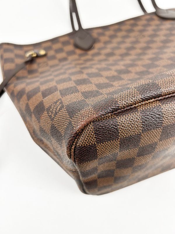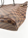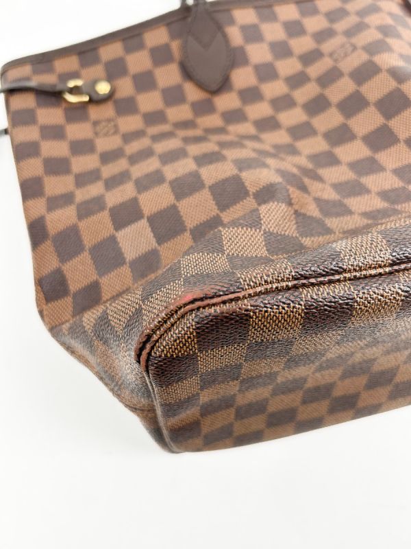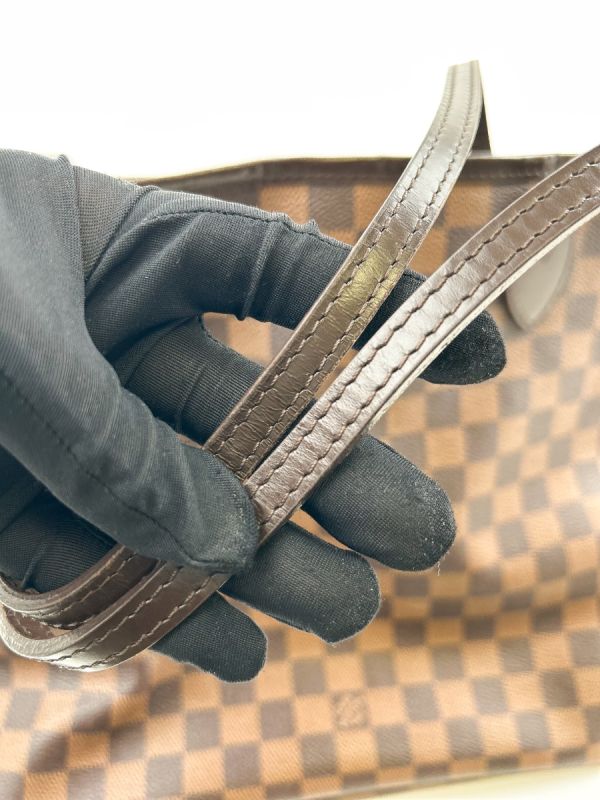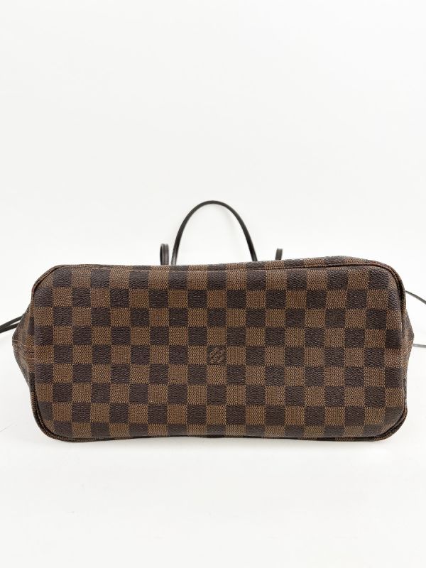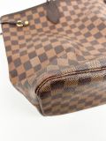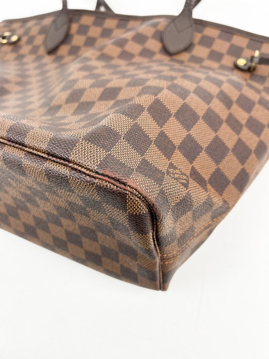 Elegant and spacious, this Louis Vuitton Neverfull bag in Damier Ebene canvas captivates with its bright red interior and timeless silhouette. Functional and refined, it features an interior zippered pocket for added convenience. Please note that there is a slight mark visible on the bottom of the bag, which does not affect its elegance or usability.