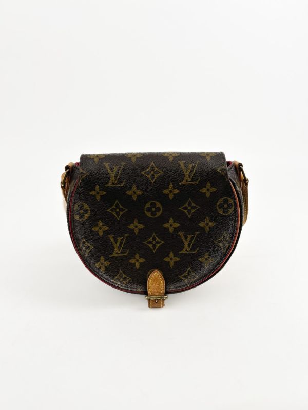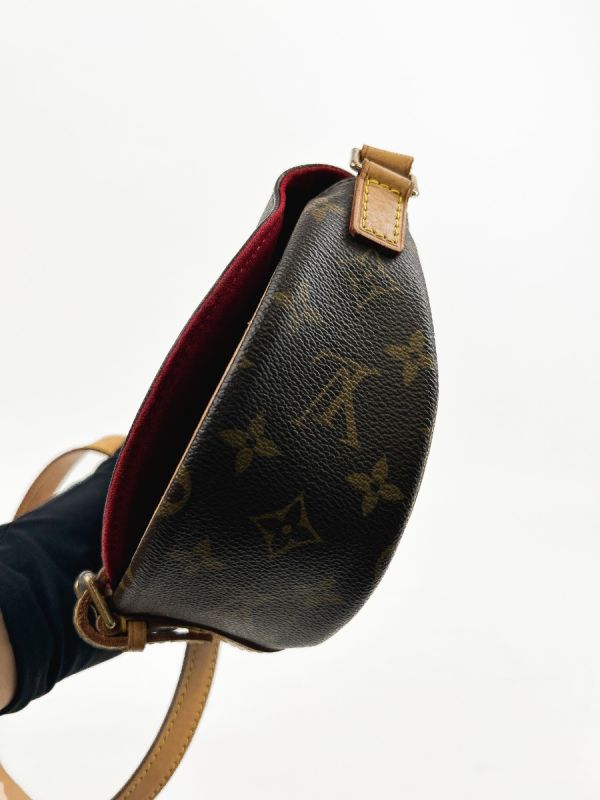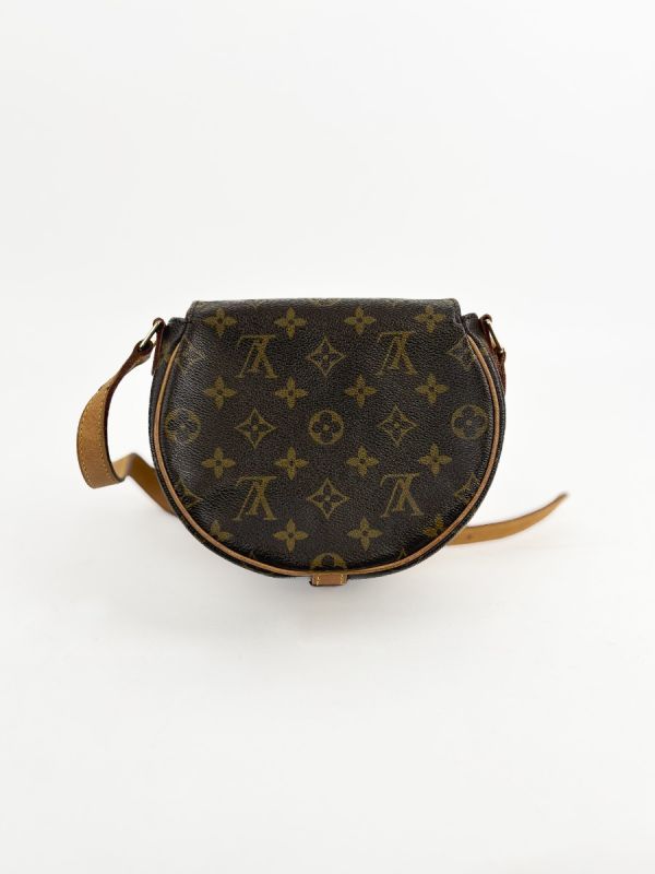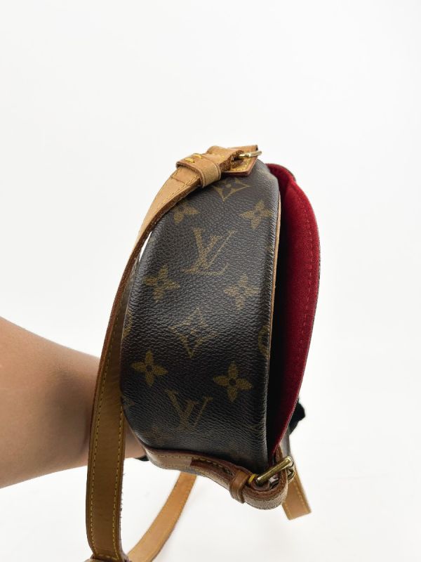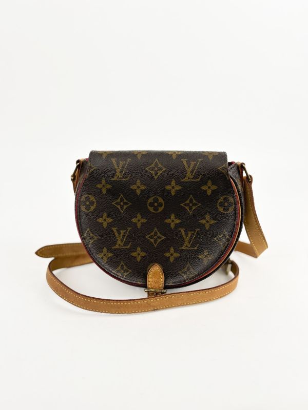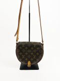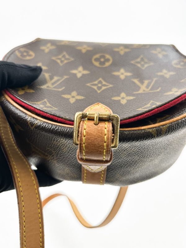 Louis Vuitton Tambourin Vintage bag in Monogram canvas, a model with classic and timeless charm. Its rounded silhouette and adjustable natural leather shoulder strap give it both elegance and practicality. The shoulder strap has a few small, slightly visible stains on the inside, which do not detract from the refined and authentic look of this iconic bag.