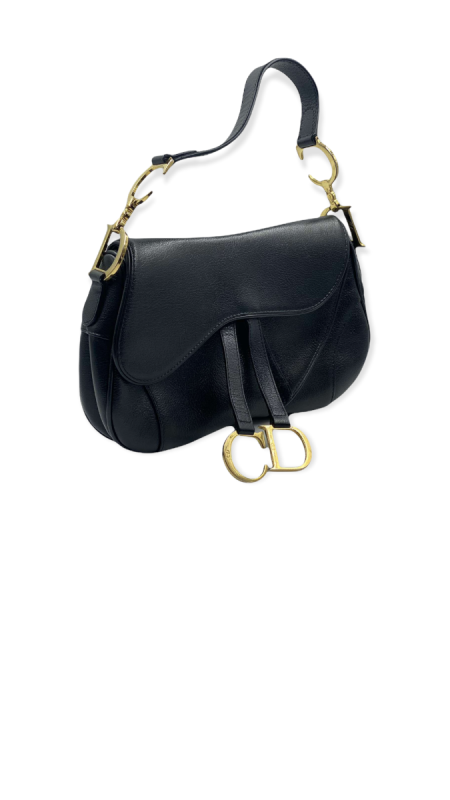 The iconic Saddle bag featuring a Saddle flap with a magnetic 'CD' stirrup clasp, it boasts a 'CD' signature on each side of the handle. The black calfskin style is embellished with antique gold-finish metal hardware. The Saddle bag may be carried by hand or worn over the shoulder and can be customized with different shoulder straps.