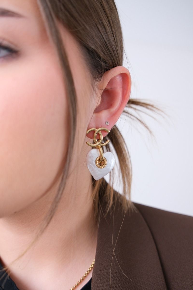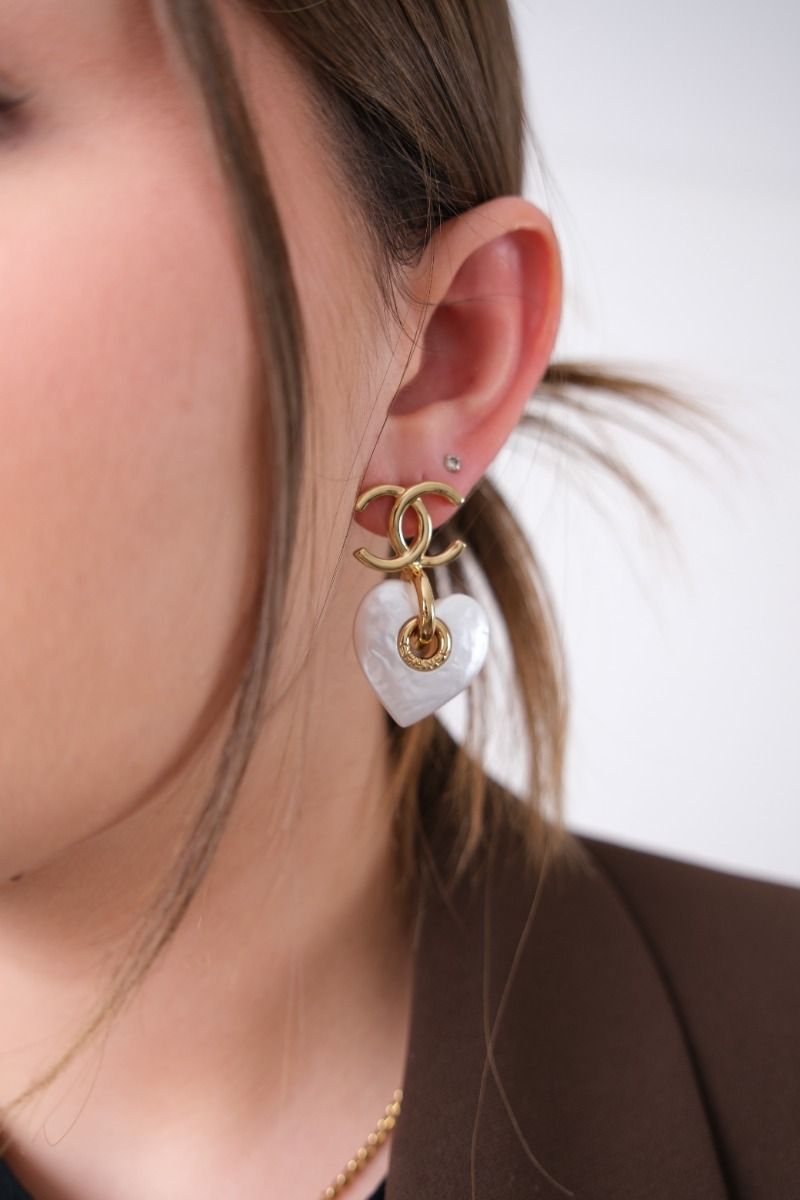 Paire de boucles d’oreilles de Chanel associant le logo CC doré à un pendentif cœur nacré. Un bijou délicat et féminin, mêlant élégance iconique et douceur de la nacre.