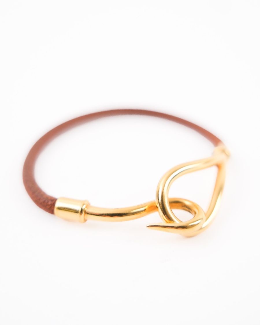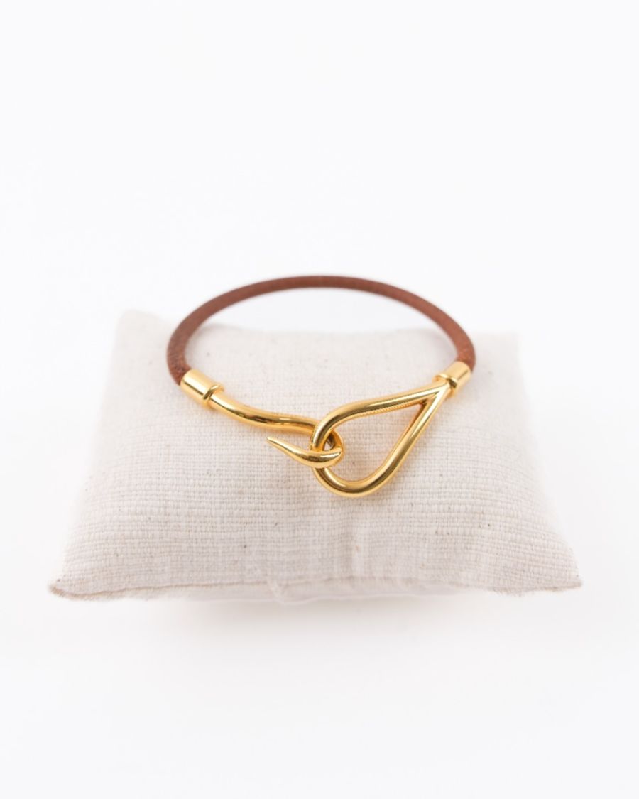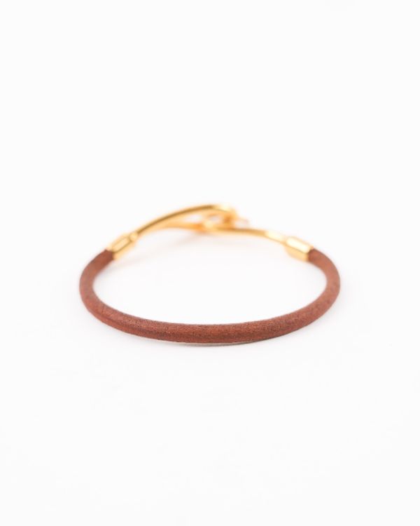 Bracelet Hermès en cuir marron, sublimé par une élégante attache en métal doré signature. Minimaliste et raffiné, il incarne parfaitement l’esprit intemporel de la Maison. Un accessoire chic et discret, idéal pour sublimer le poignet au quotidien.