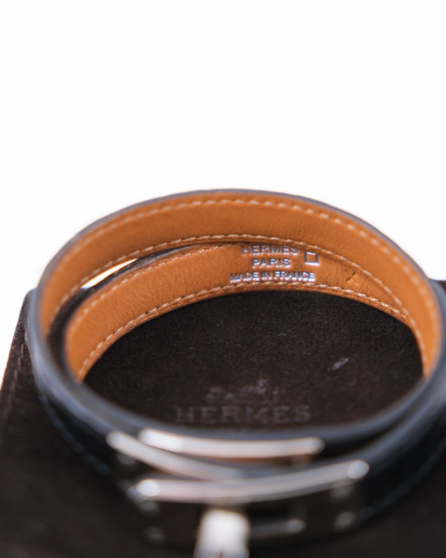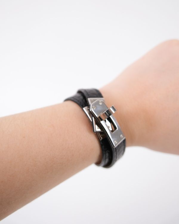 Ce bracelet Hermès Kelly Double Tour en alligator lisse noir incarne l’élégance iconique de la Maison. Inspiré du célèbre fermoir du sac Kelly, il se distingue par sa boucle argentée raffinée et son double tour délicat autour du poignet. Un bijou intemporel et sophistiqué, parfait pour sublimer toutes vos tenues avec discrétion et caractère.