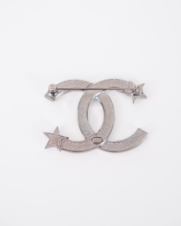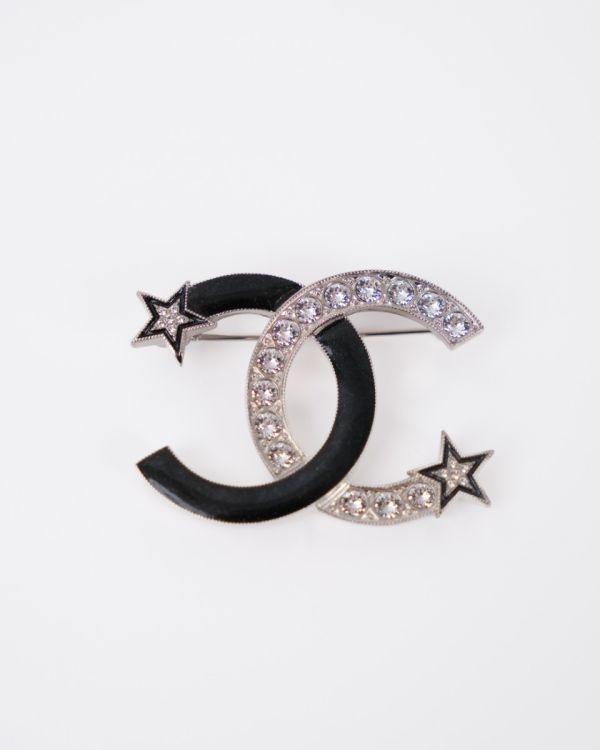 Broche Chanel CC En Email Noir Etoile Silver Strass