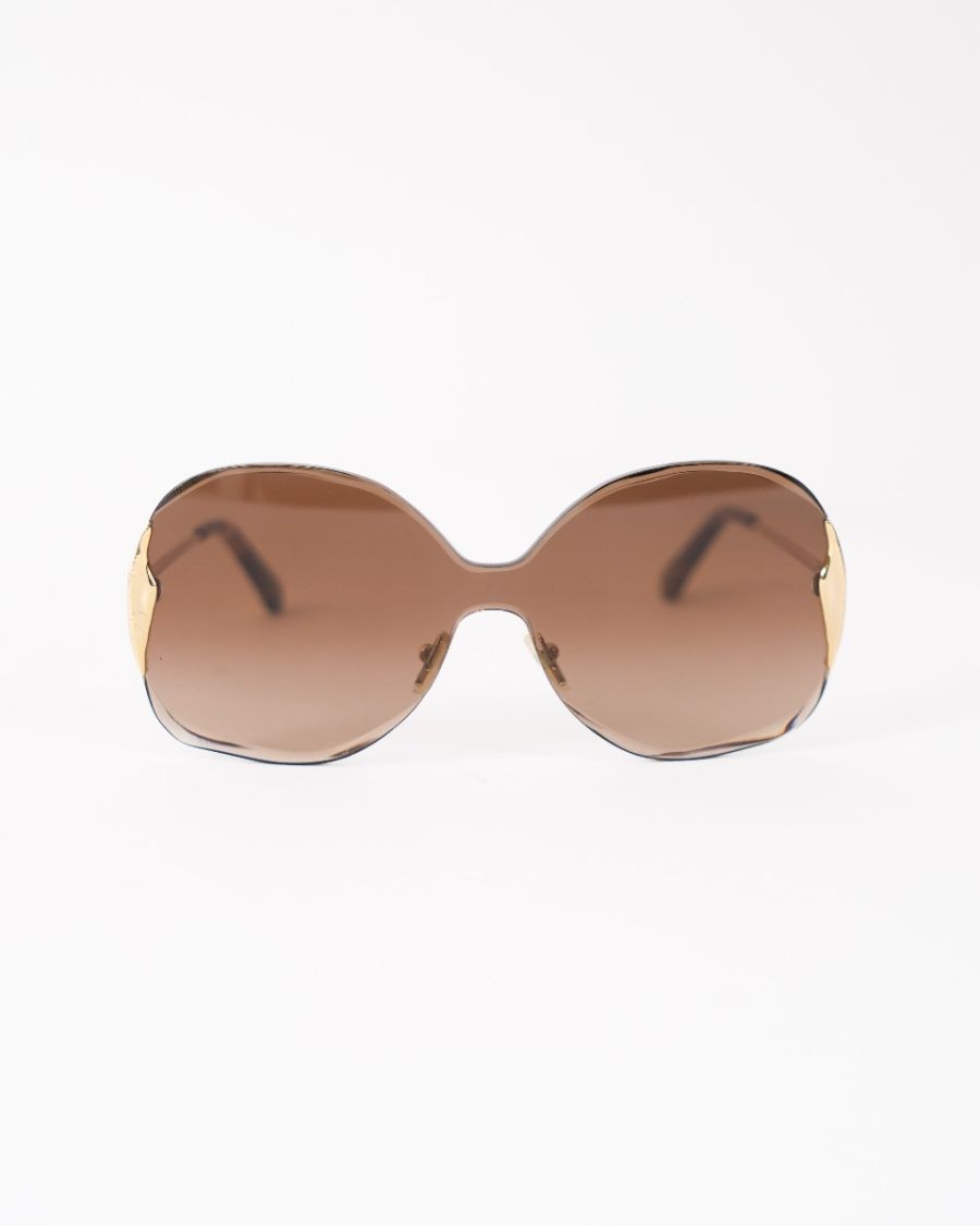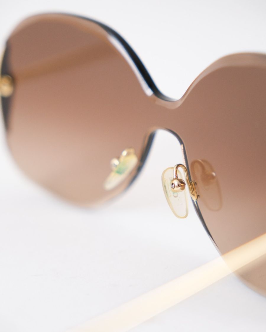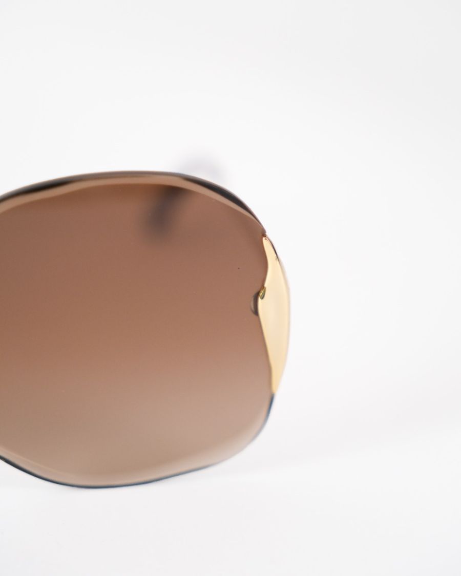 Lunettes de soleil Chloé au design oversize, dotées de verres teintés marron et d’une monture élégamment travaillée avec détails métalliques dorés. Féminines et sophistiquées, elles offrent une allure glamour tout en assurant une protection solaire optimale. Un accessoire chic et intemporel, signature de la Maison Chloé.