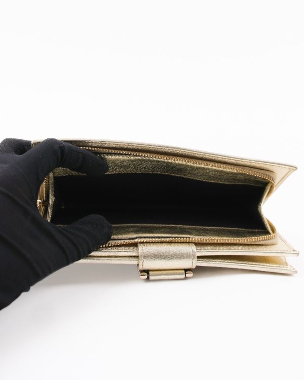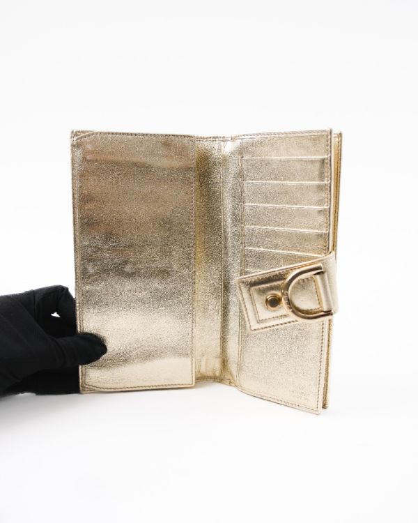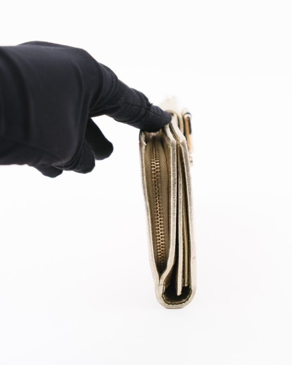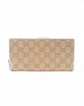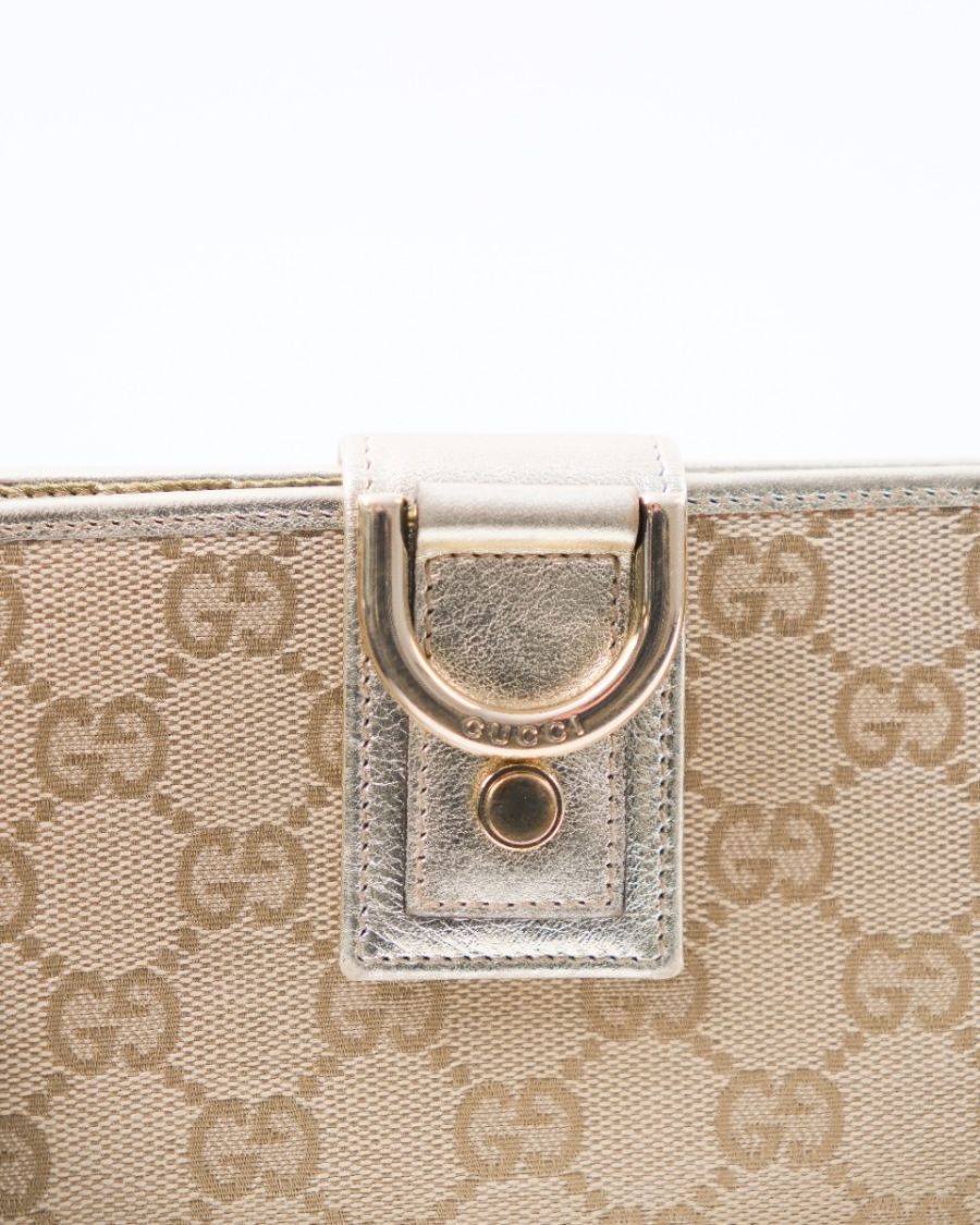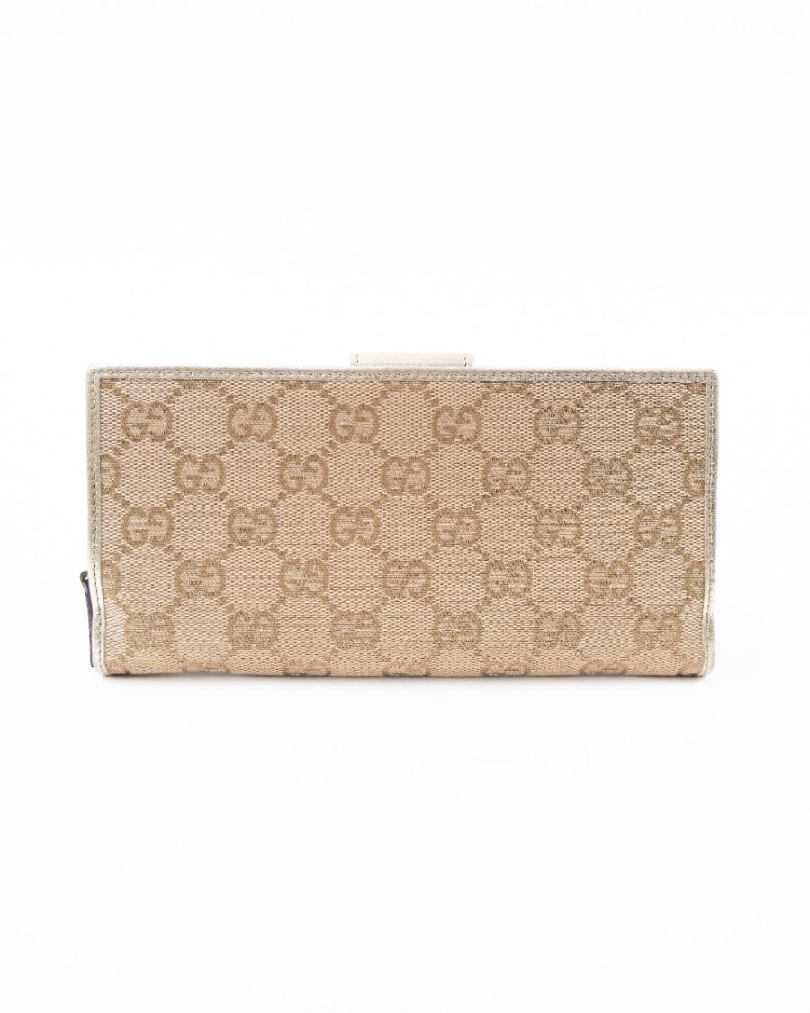 Portefeuille Gucci en toile GG beige, sublimé par une finition en cuir métallisé et un détail signature en métal doré gravé Gucci. Élégant et fonctionnel, il offre un format pratique pour organiser cartes, billets et essentiels du quotidien. Une pièce iconique au style intemporel, parfaite pour compléter une collection de maroquinerie de luxe.