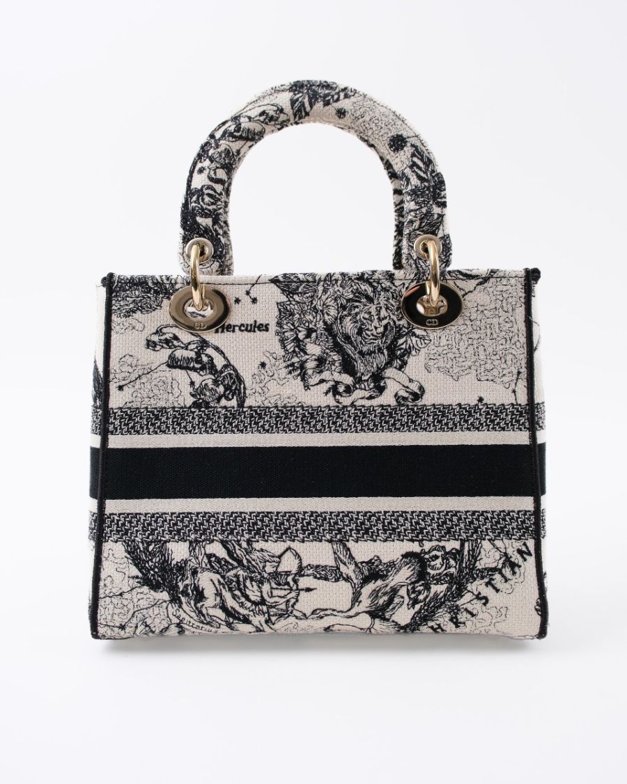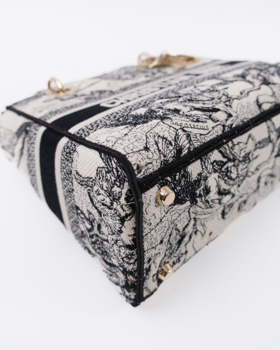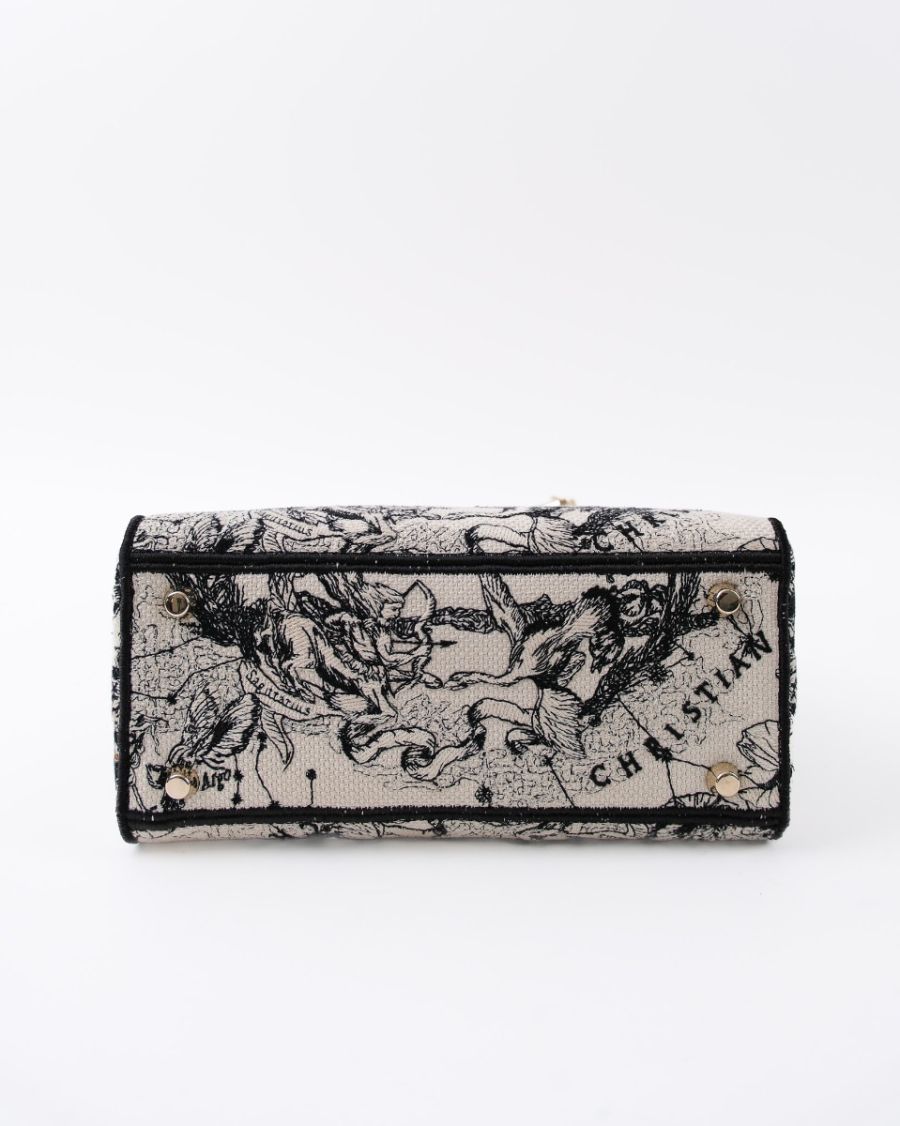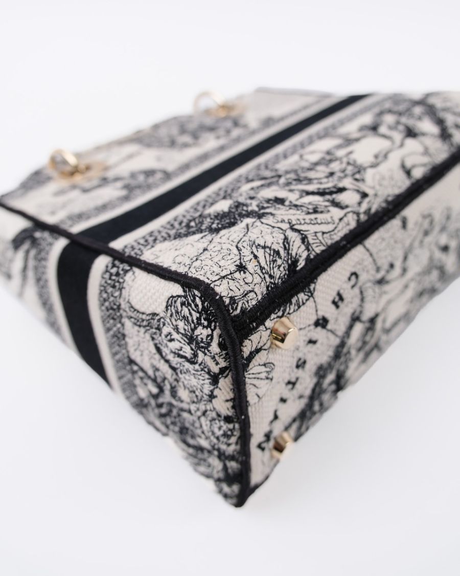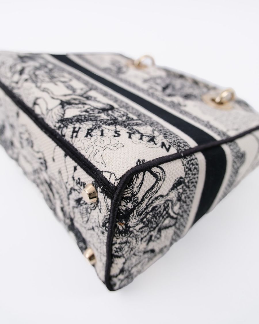Ce sac iconique Christian Dior séduit par sa toile brodée noire et blanche ornée du motif Toile de Jouy, signature emblématique de la Maison. Son format structuré, ses anses élégantes et sa bandoulière ajustable en font un modèle aussi chic que pratique. Une pièce couture au caractère affirmé, idéale pour sublimer un look avec élégance et modernité.