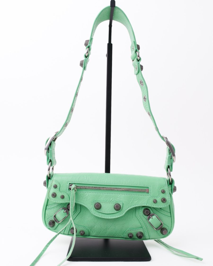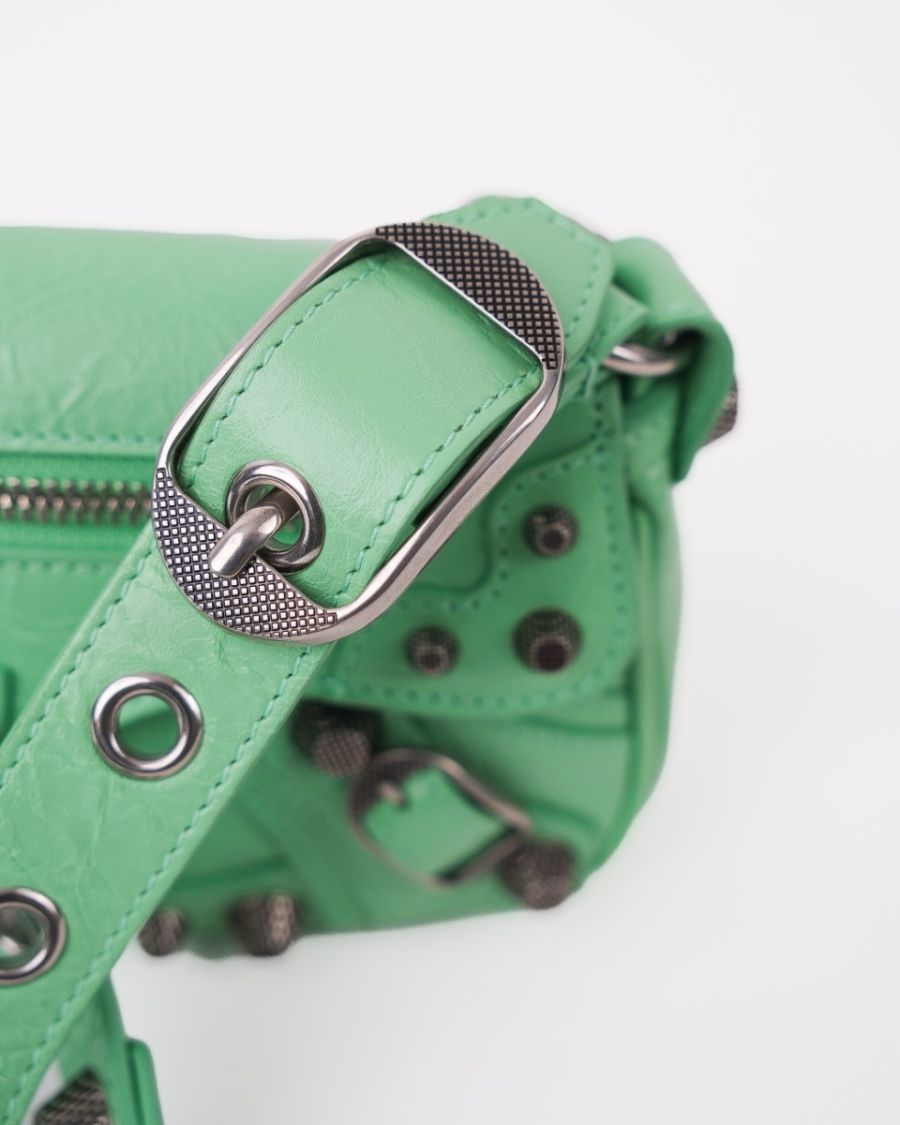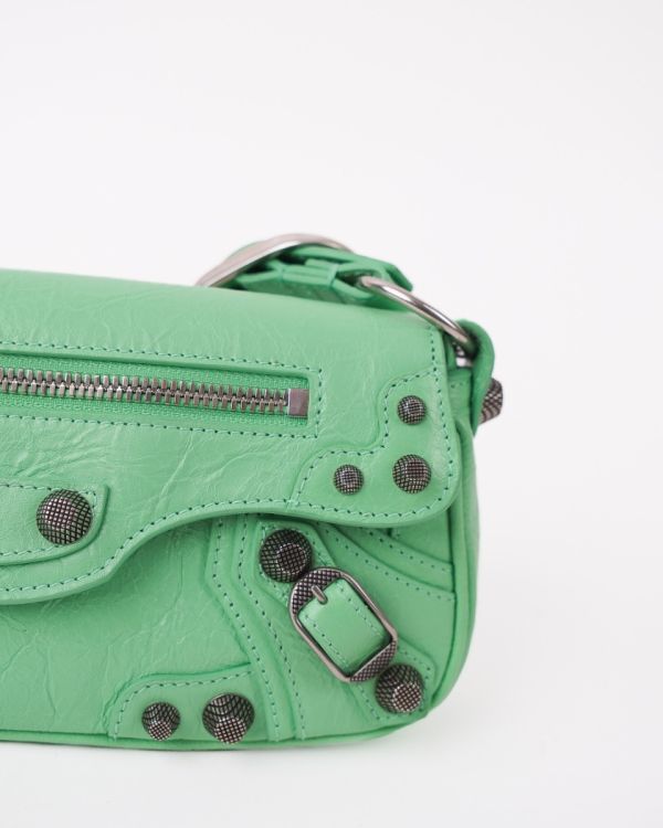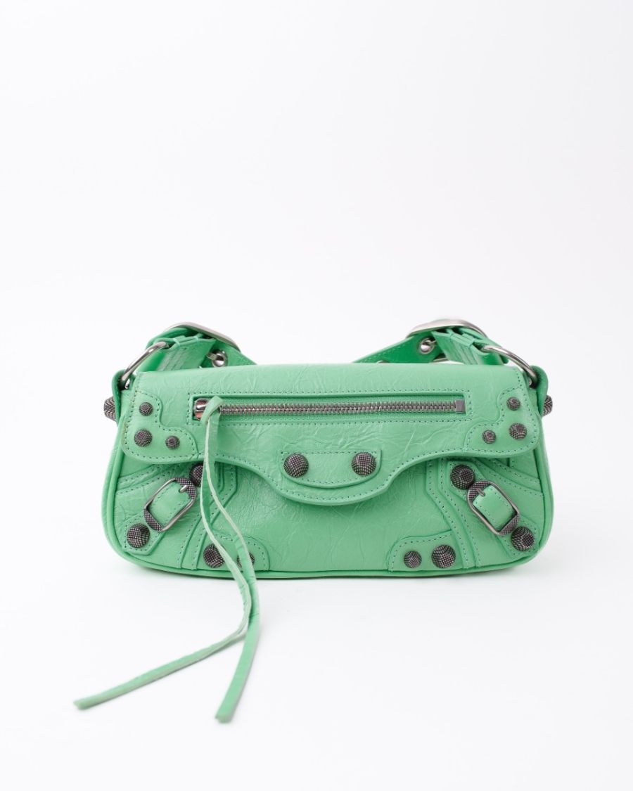 Sac Balenciaga Le Cagole XS en cuir vert souple, à l’aspect légèrement froissé. Il se distingue par ses clous et boucles métalliques argentées emblématiques, signature de la ligne Cagole. Son format XS est compact mais fonctionnel, idéal pour transporter l’essentiel. Doté d’une poche zippée à l’avant et d’une bandoulière pour un porté épaule ou crossbody, c’est une pièce au style affirmé, parfaite pour apporter une touche mode et audacieuse à une tenue.