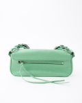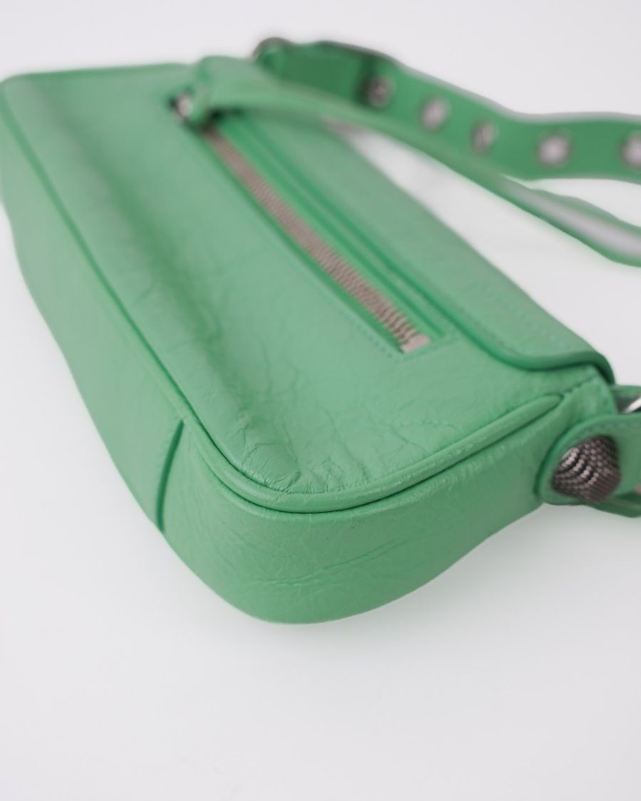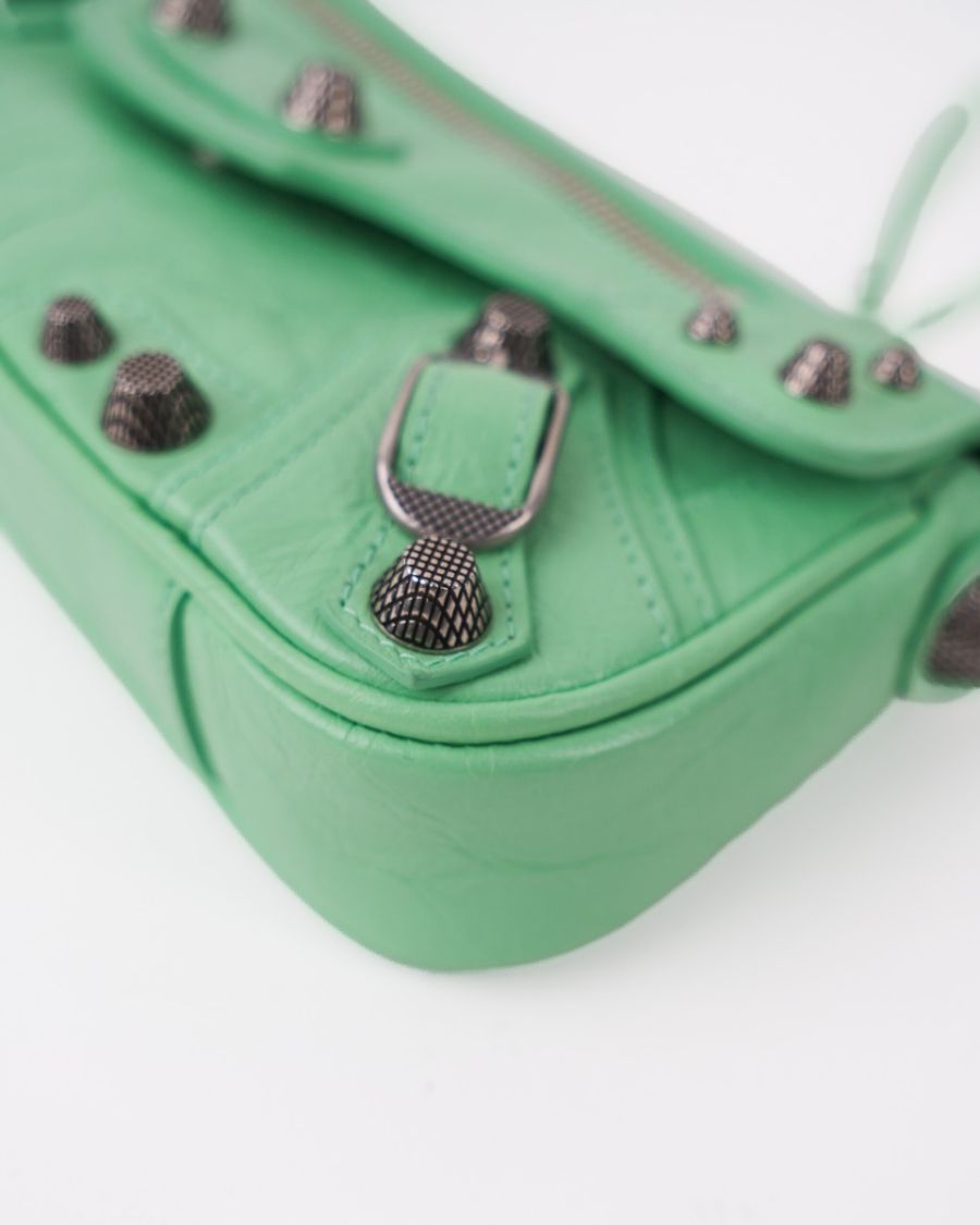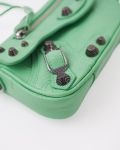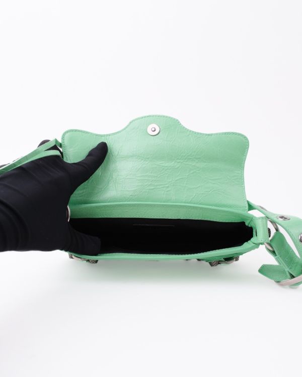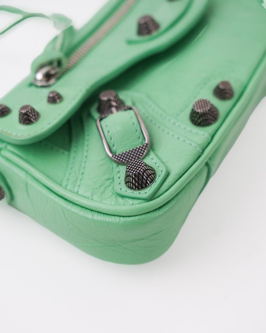 Sac Balenciaga Le Cagole XS en cuir vert souple, à l’aspect légèrement froissé. Il se distingue par ses clous et boucles métalliques argentées emblématiques, signature de la ligne Cagole. Son format XS est compact mais fonctionnel, idéal pour transporter l’essentiel. Doté d’une poche zippée à l’avant et d’une bandoulière pour un porté épaule ou crossbody, c’est une pièce au style affirmé, parfaite pour apporter une touche mode et audacieuse à une tenue.