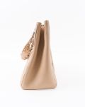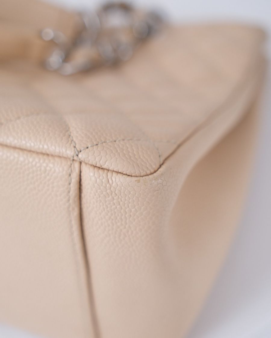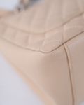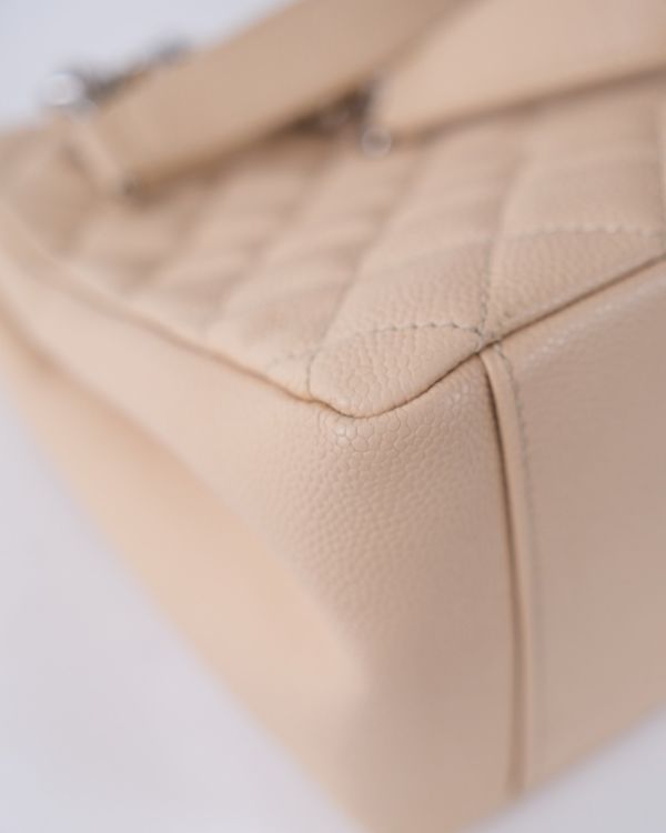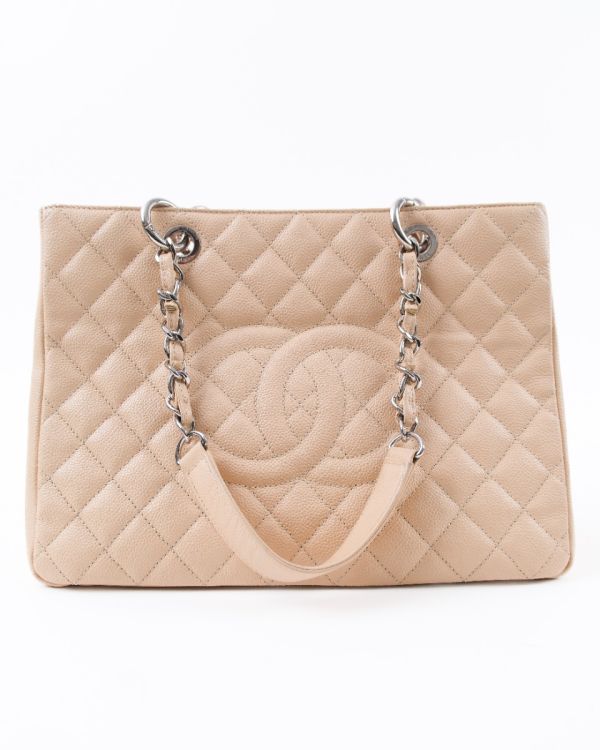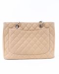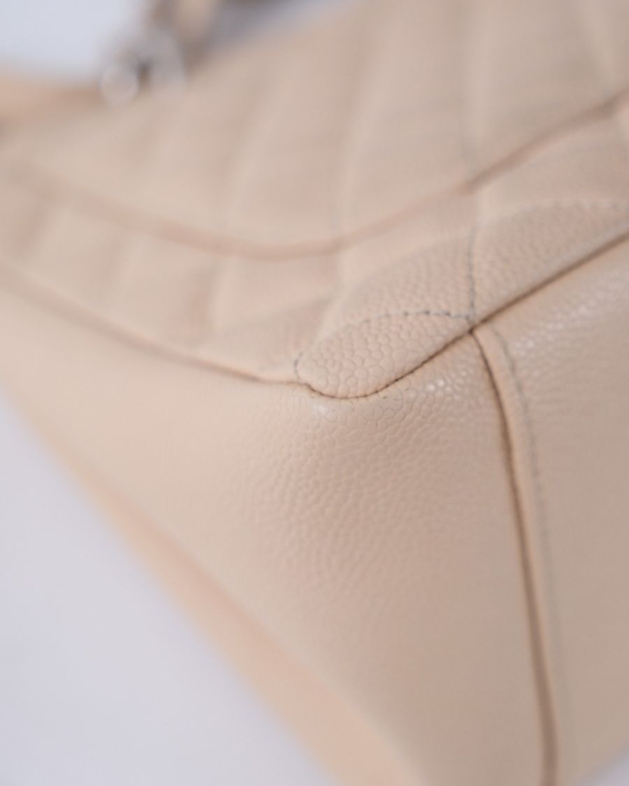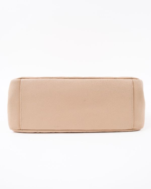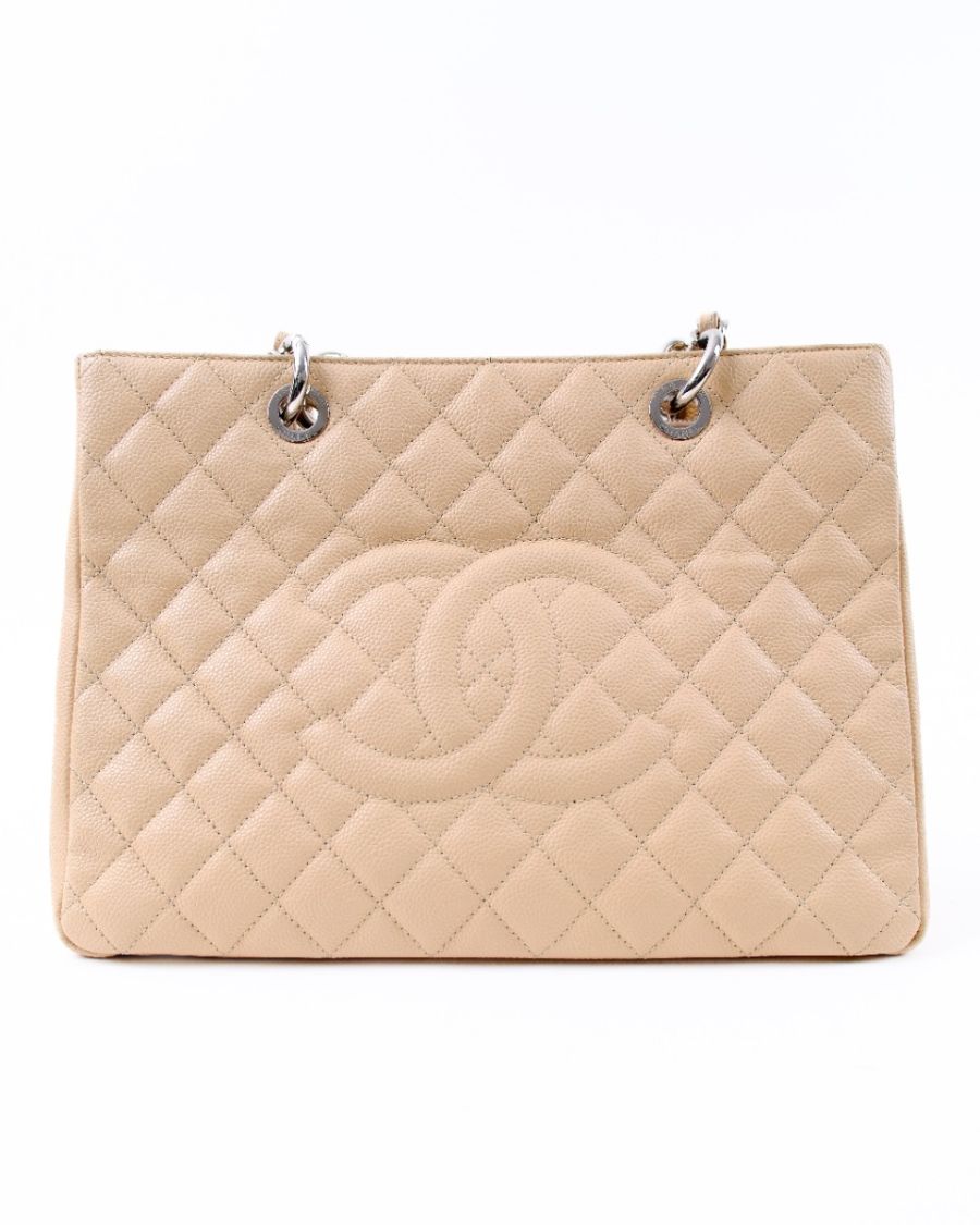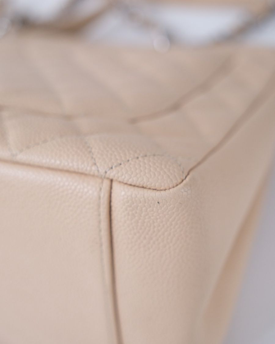 Sac Chanel Timeless en cuir beige matelassé, sublimé par l’iconique motif losange et le double C signature. Doté de poignées en cuir entrelacées de chaînes dorées, il allie élégance et fonctionnalité pour un porté main ou épaule. Un modèle intemporel et raffiné, emblématique du savoir-faire de la Maison Chanel.