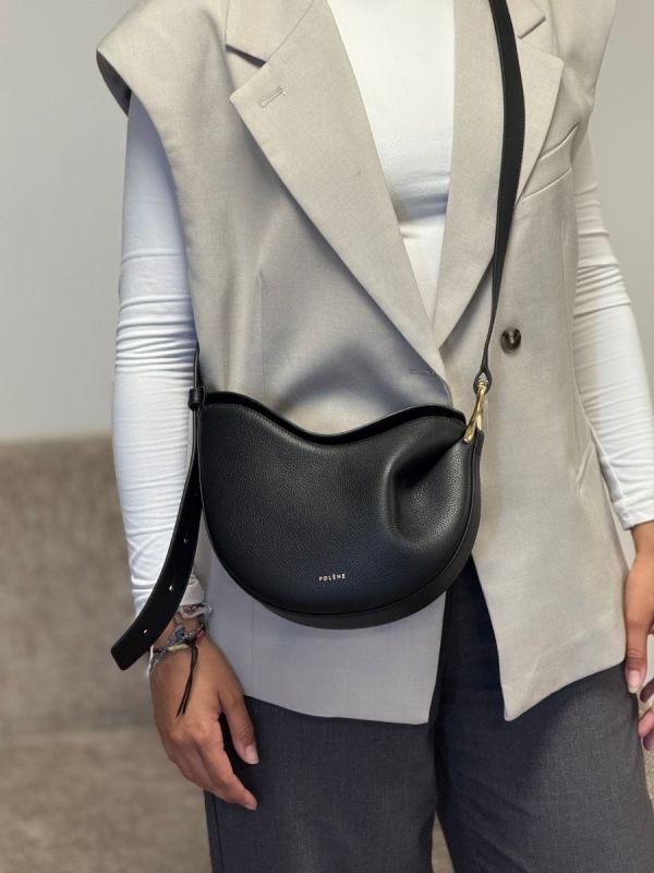 Le sac Tonca de Polène en cuir grainé noir séduit par sa forme arrondie et sa boucle dorée raffinée. Son porté modulable offre une élégance discrète et moderne.