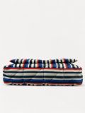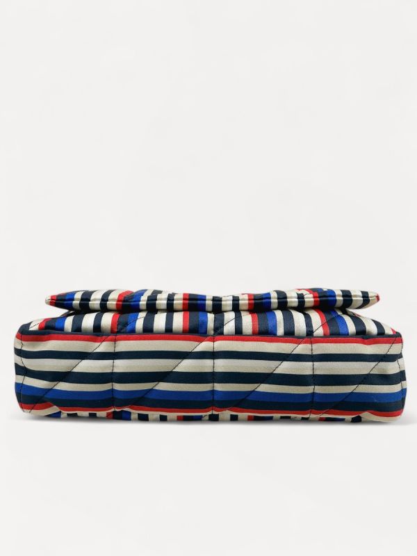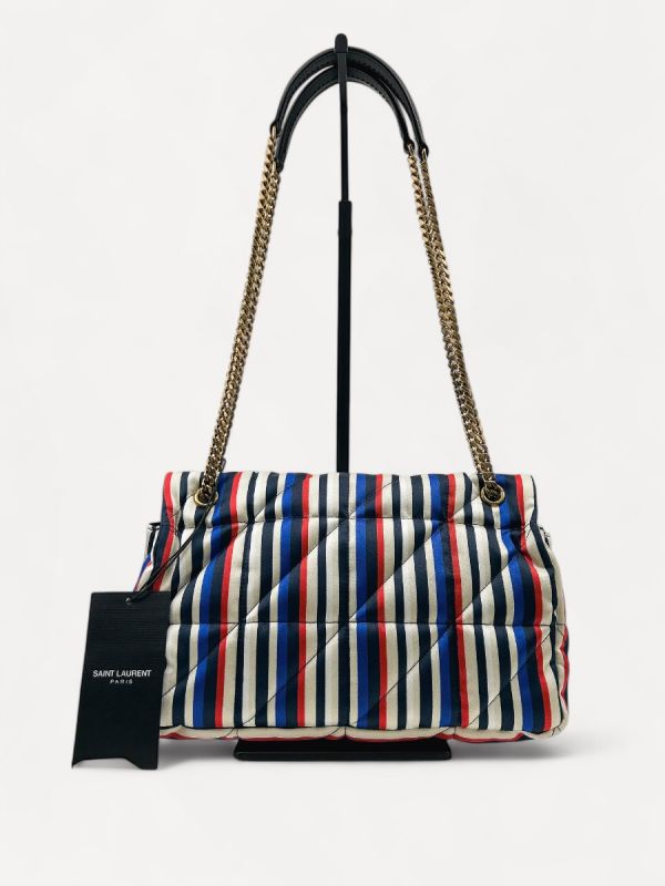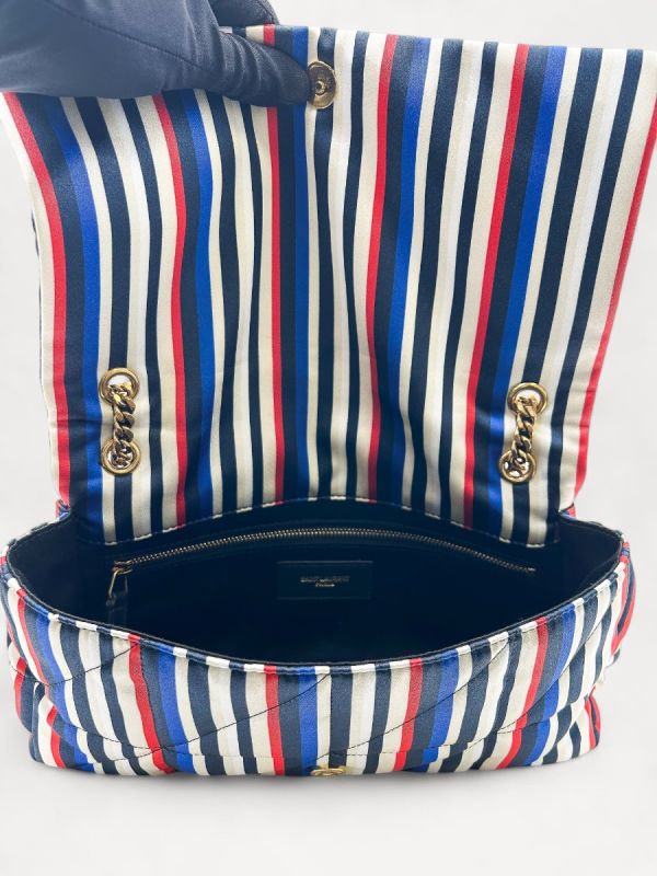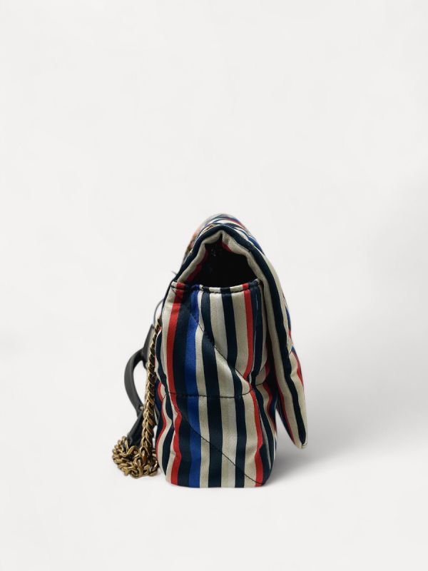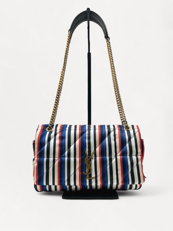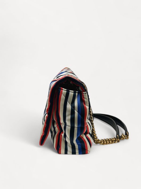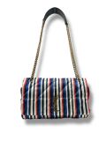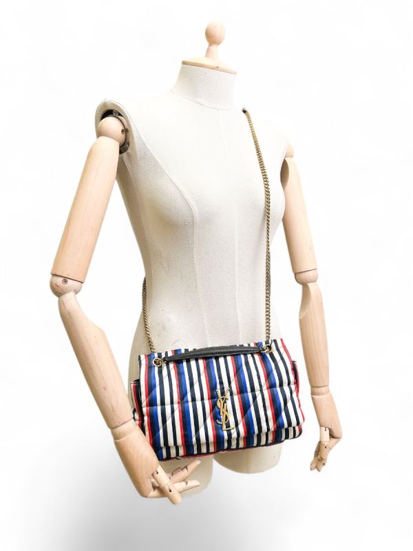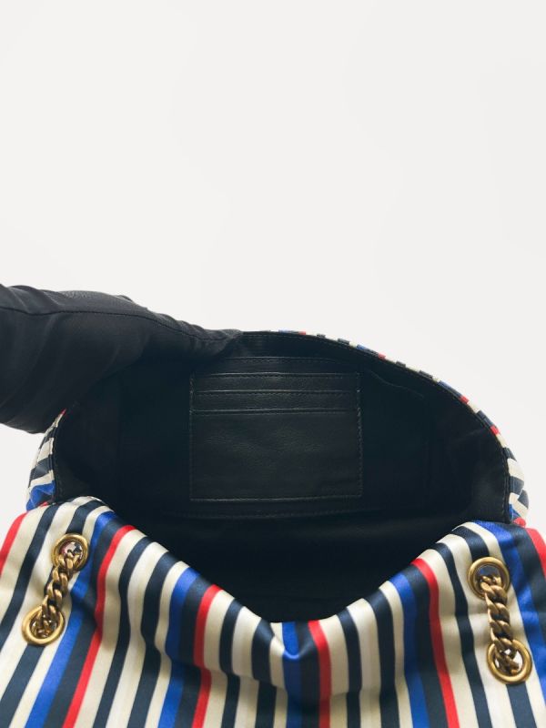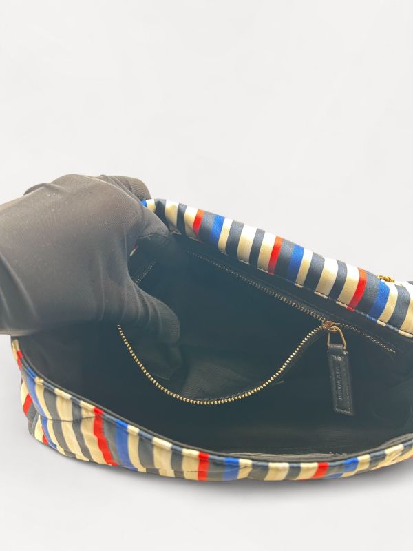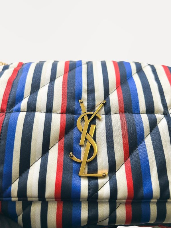 Élégant et original, ce sac à main Saint Laurent Jamie séduit par son matelassage graphique et son imprimé à rayures multicolores dans des tons bleu, rouge et crème. Orné du logo YSL doré emblématique sur le rabat, il incarne parfaitement l’alliance du chic parisien et d’une touche contemporaine. Sa chaîne dorée ajustable permet un porté épaule ou croisé, pour un style à la fois raffiné et moderne.