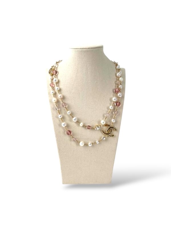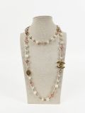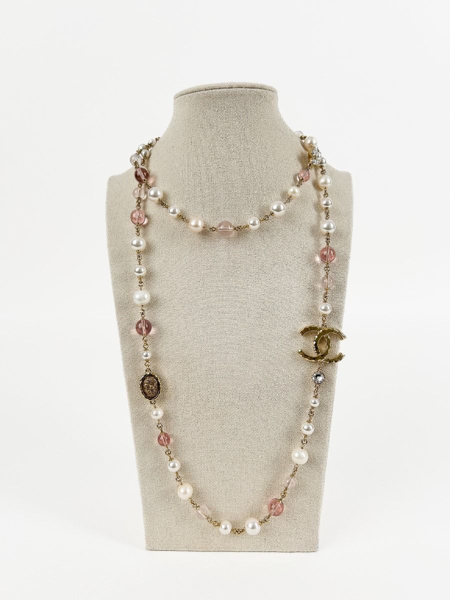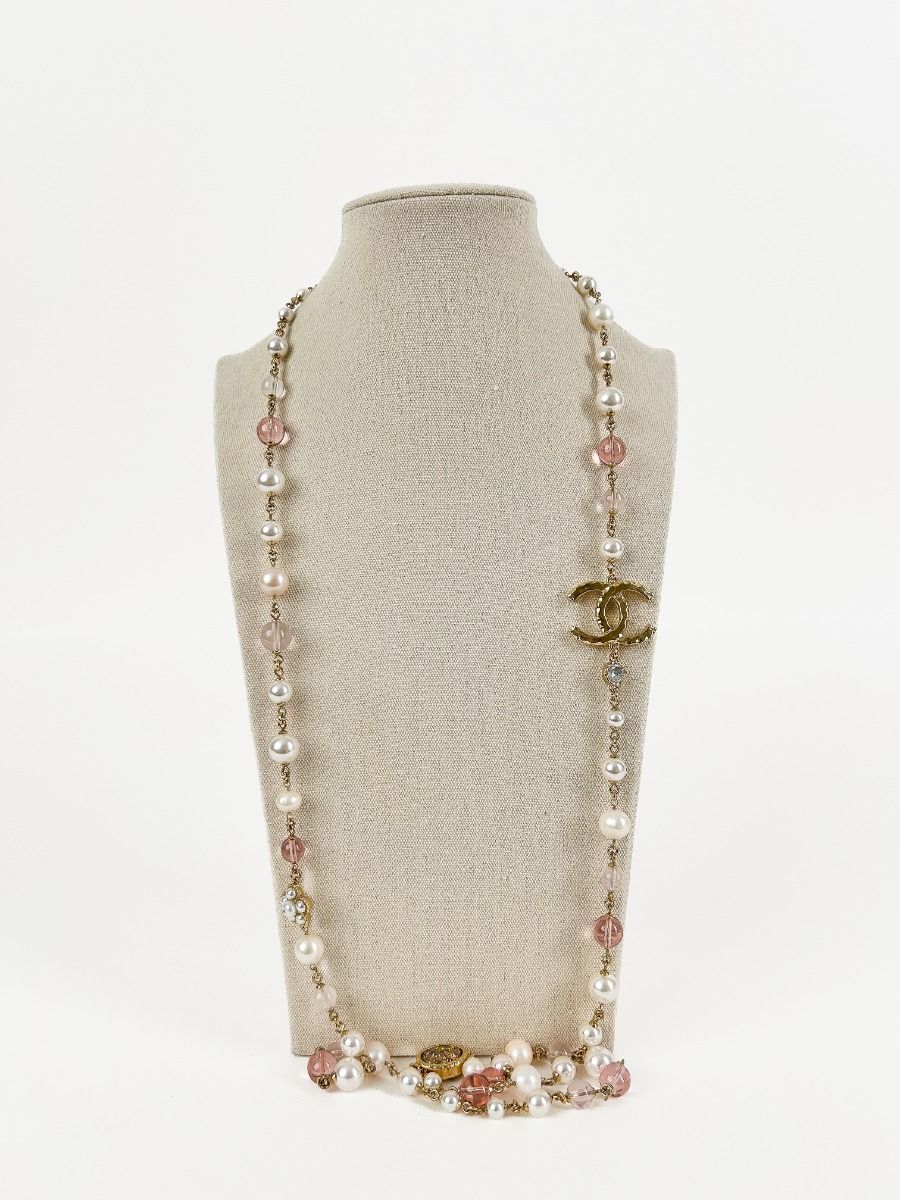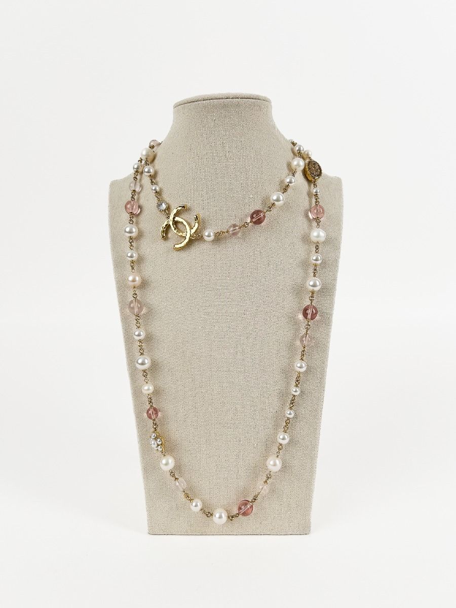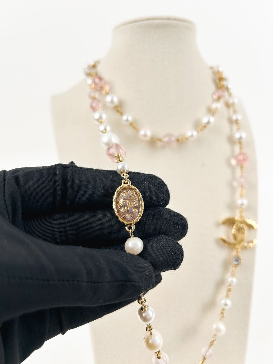 Sautoir Chanel CC Doré à Perles Roses et Blanches