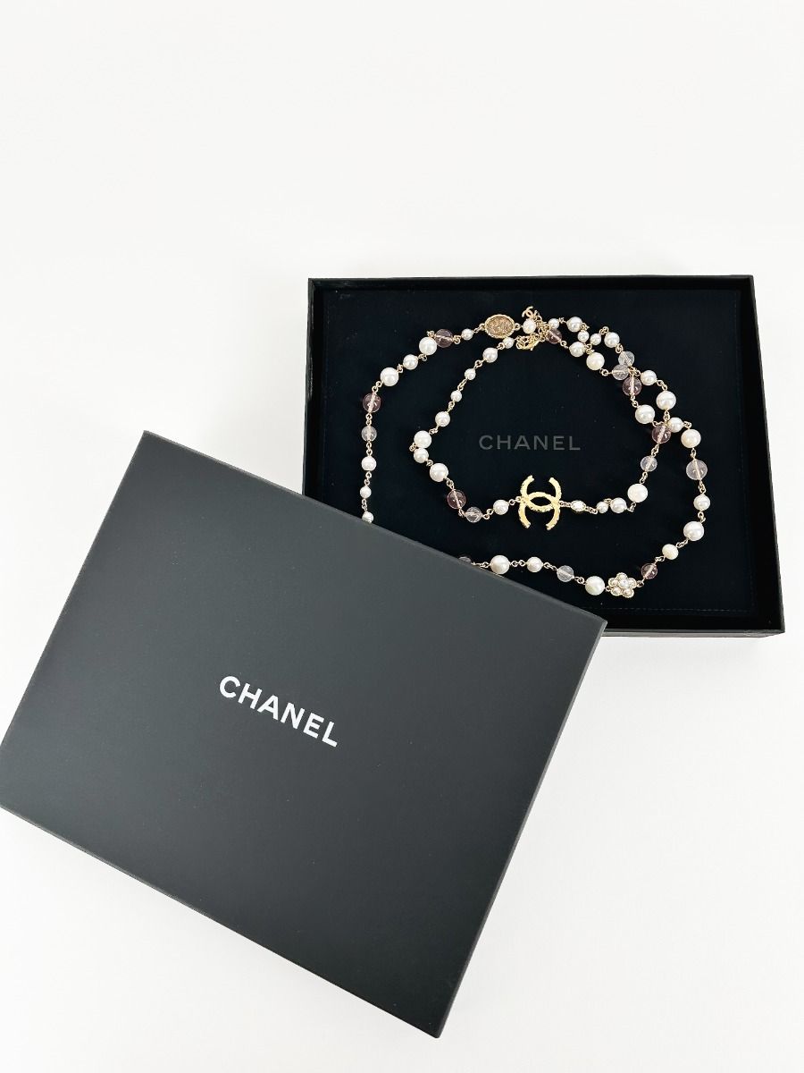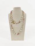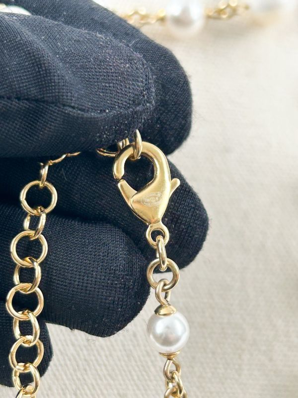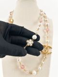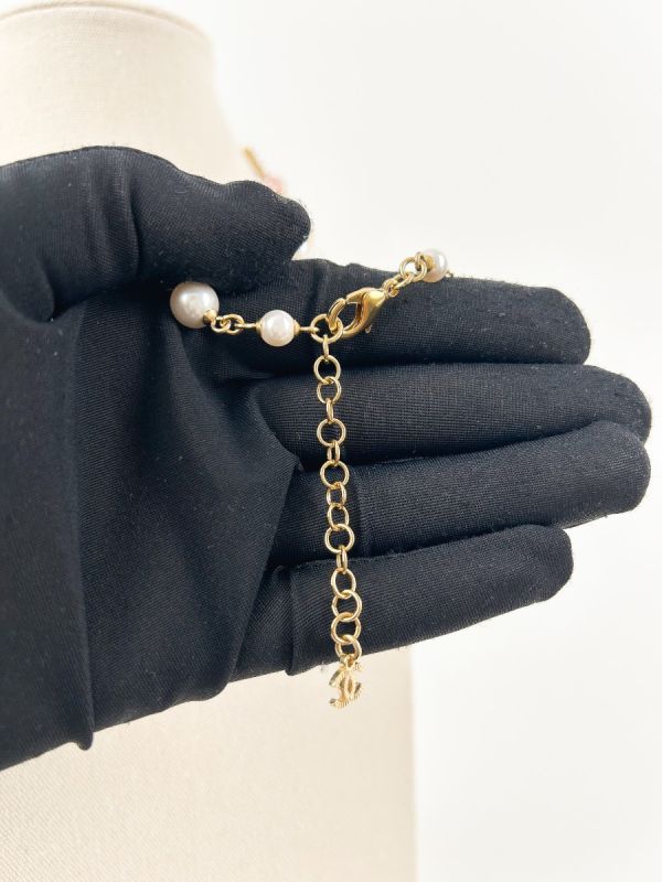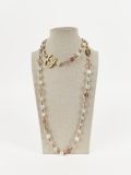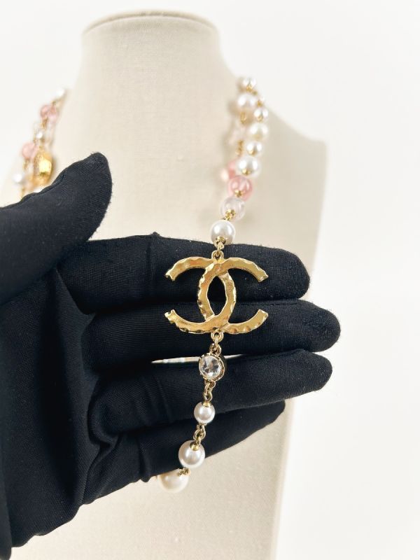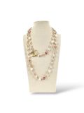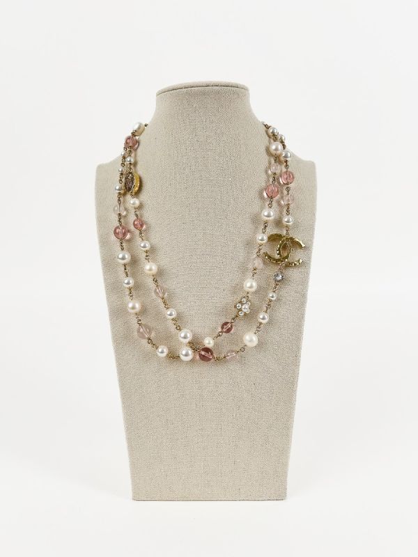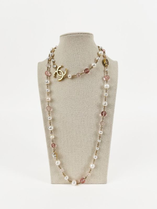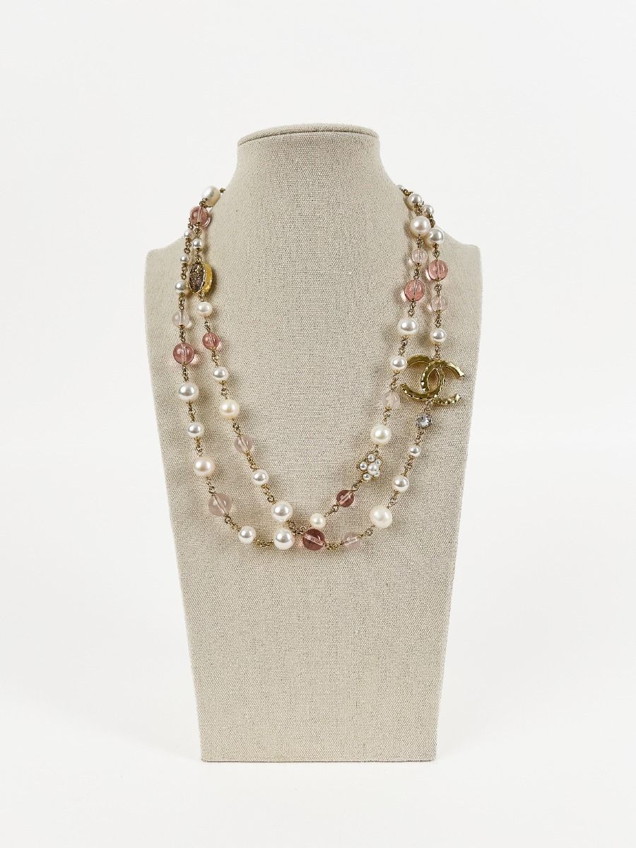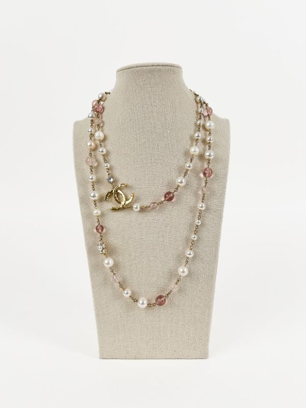 Sautoir Chanel CC Doré à Perles Roses et Blanches